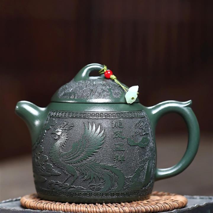 390cc原礦綠泥江山龍吟滿刻秦權茶壺POT9124