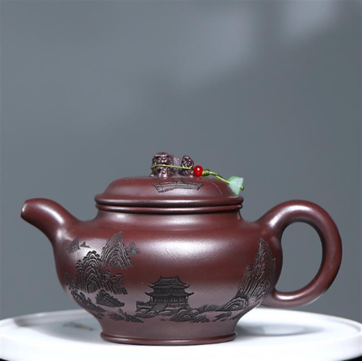 660cc原礦石紅泥滿刻山河鶴影茶壺POT8551