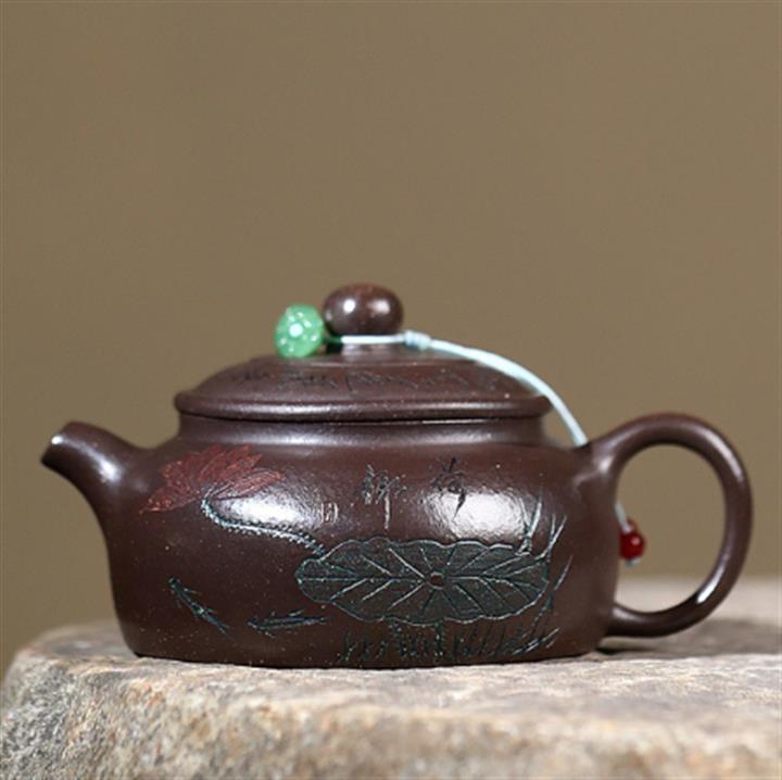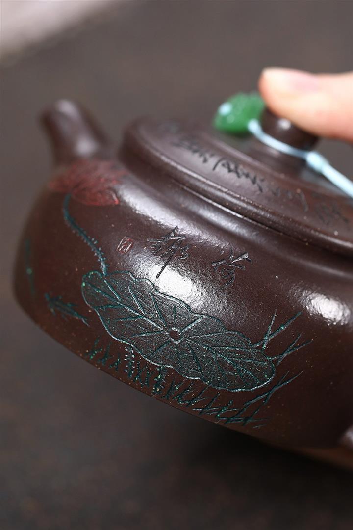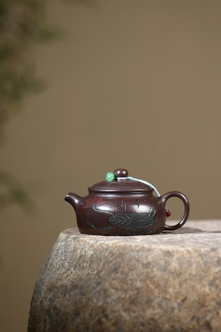 原礦紫泥金魚蓮子荷葉側把壺POT6837