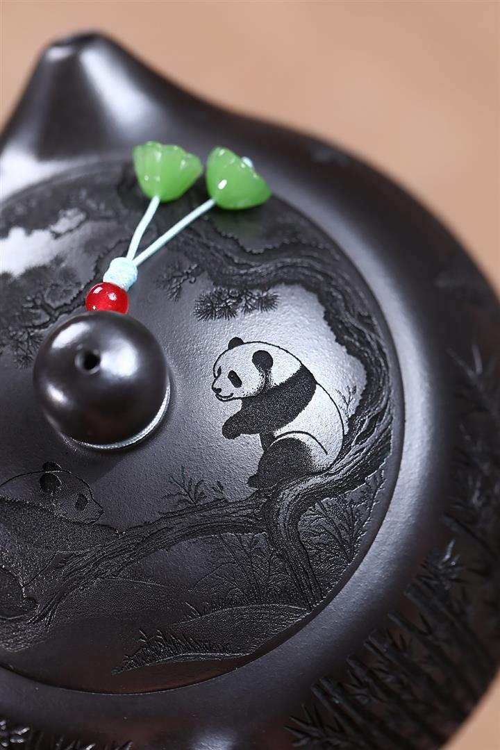 原礦石黃泥滿刻熊貓西施茶壺POT7412
