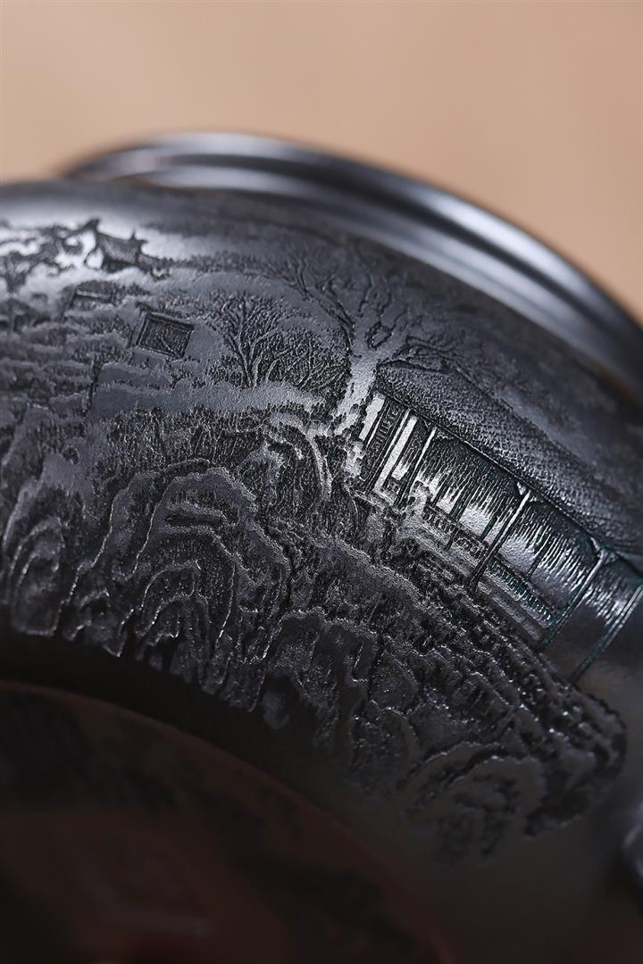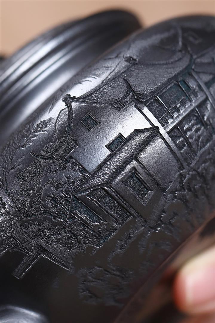 【作品介紹】作品深蘊內涵,做工細致典雅,型用完備,器形端莊穩重,比例協調,結構嚴謹,泥色潤澤。
