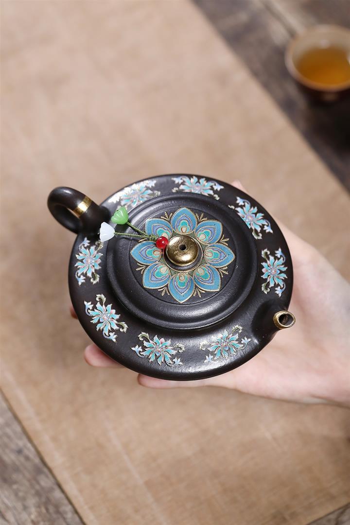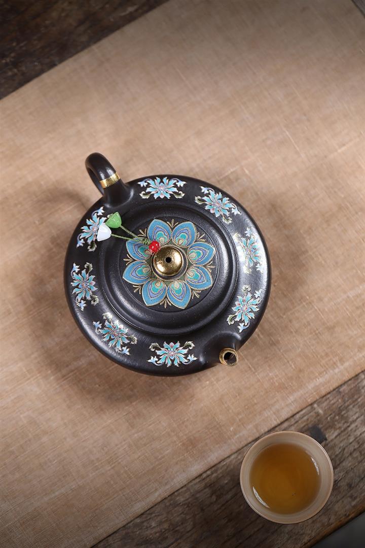 原礦朱泥琺瑯彩描金虛扁文人茶壺POT7422