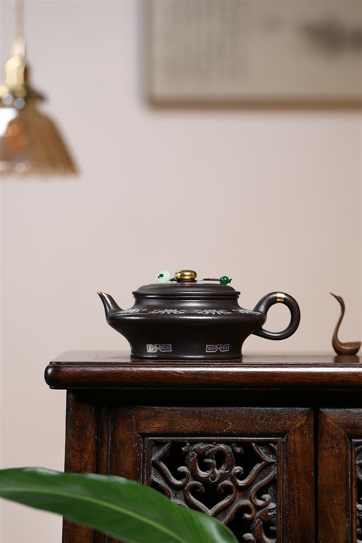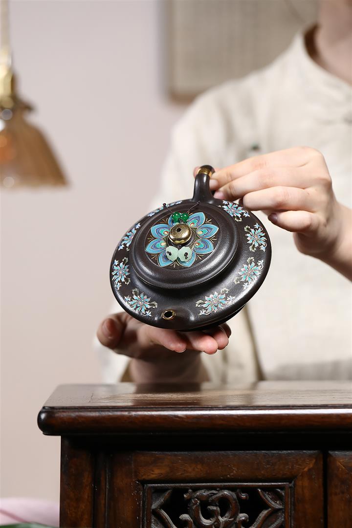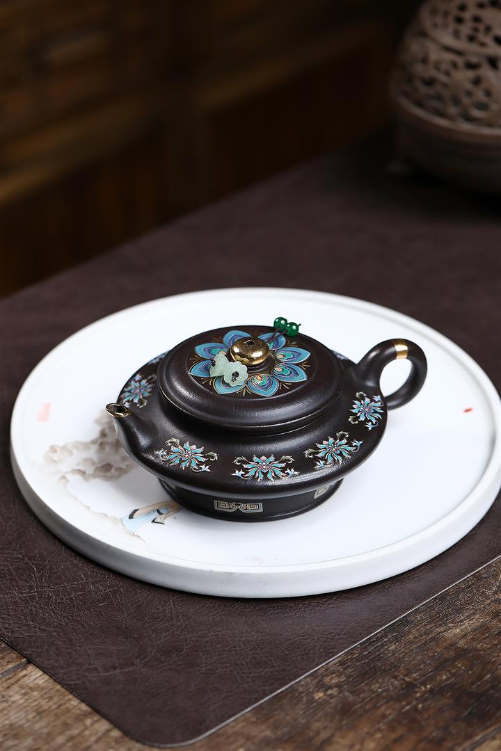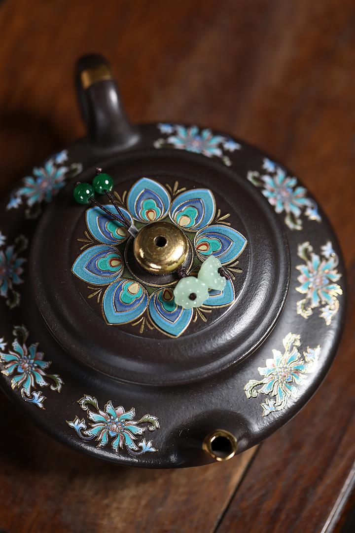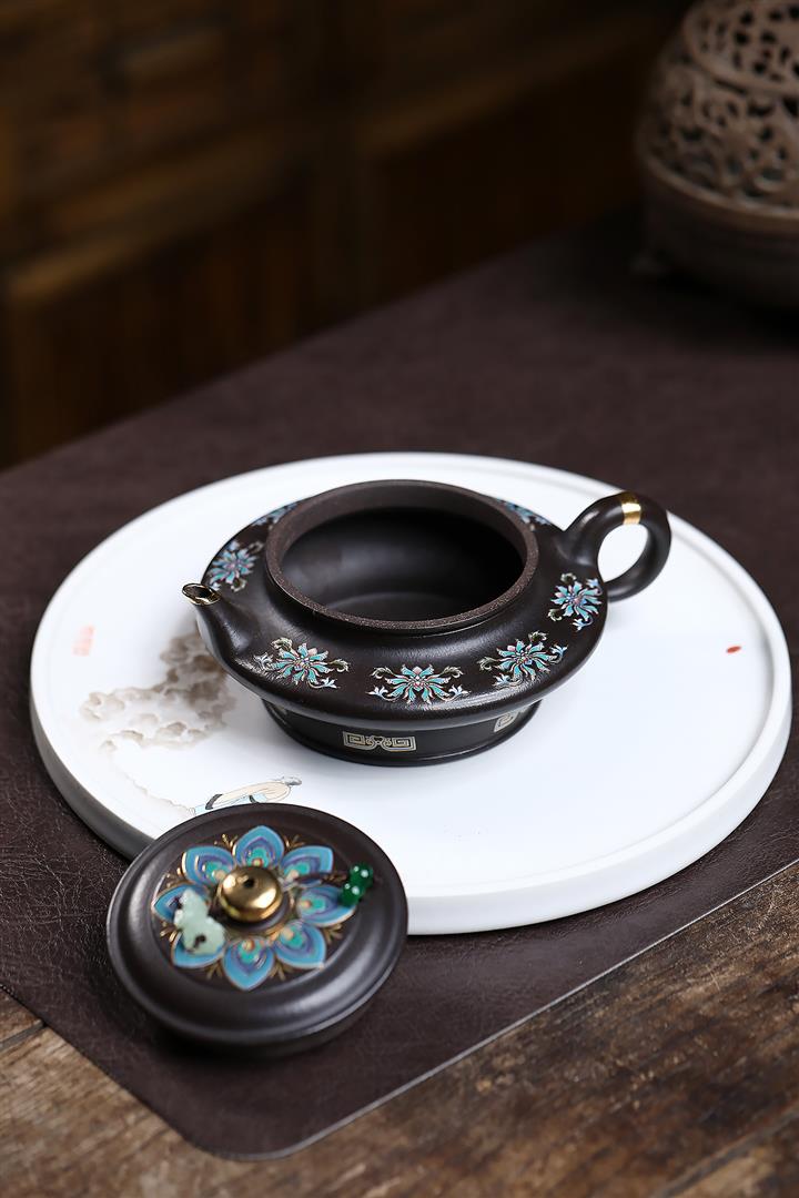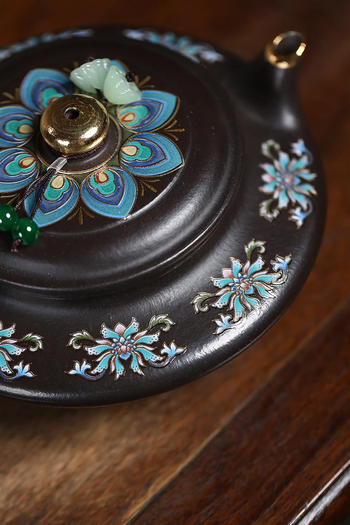 捂灰朱泥琺瑯彩燒虛扁茶壺POT7453