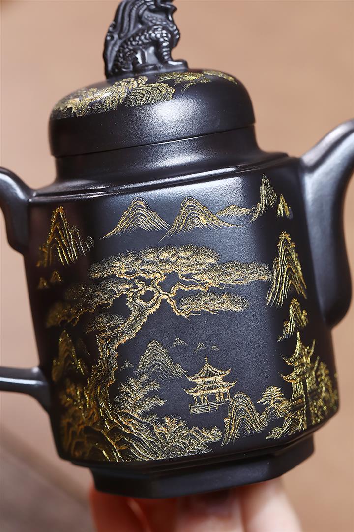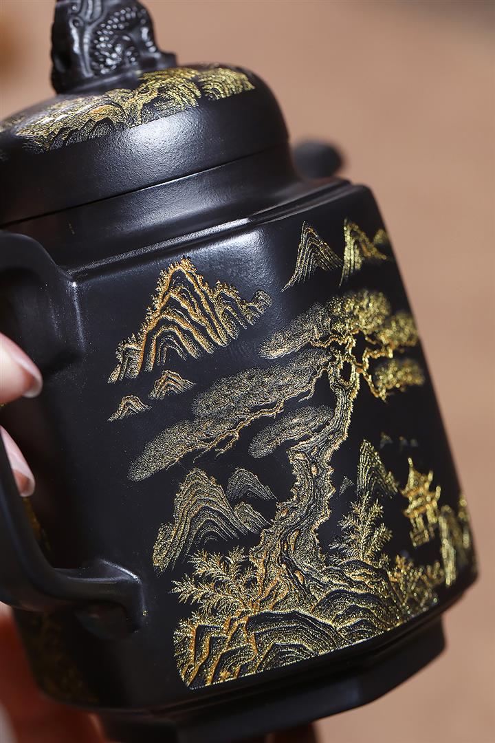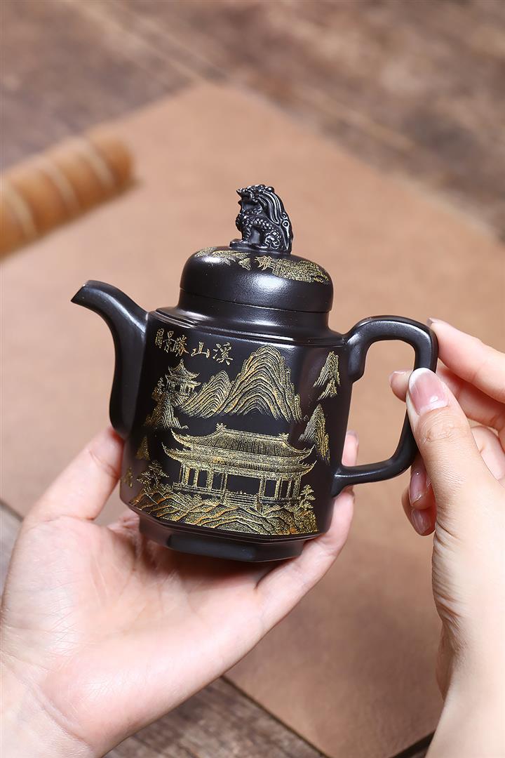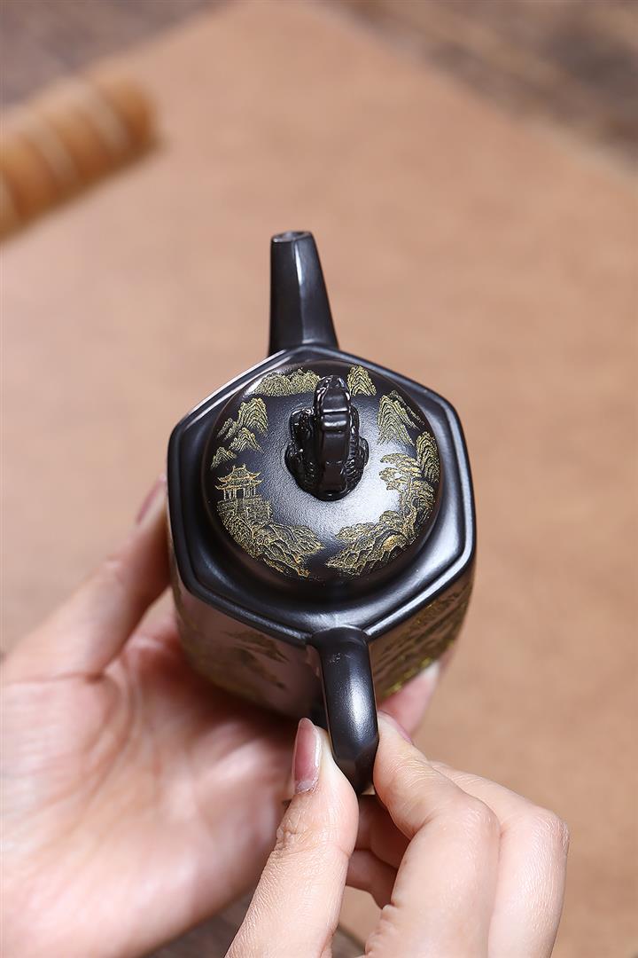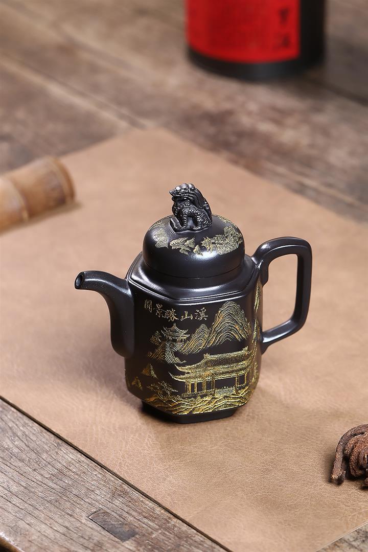 原礦玄鐵石黃六方溪山茶壺POT7579