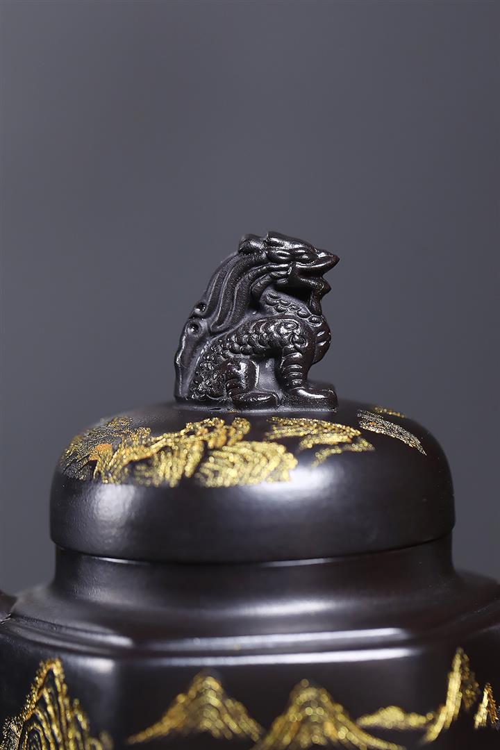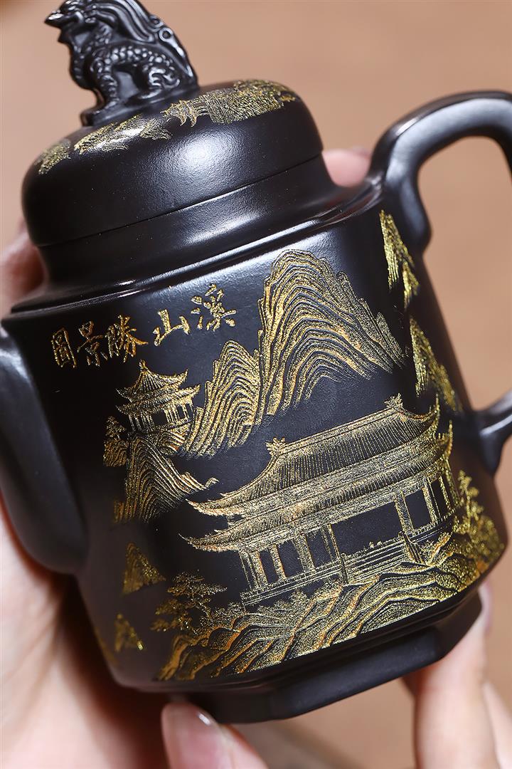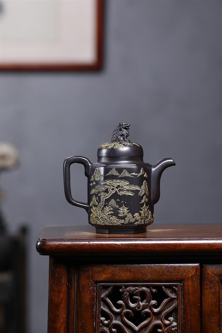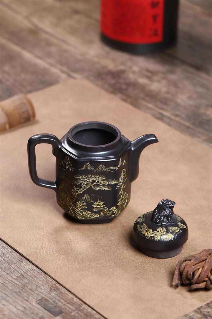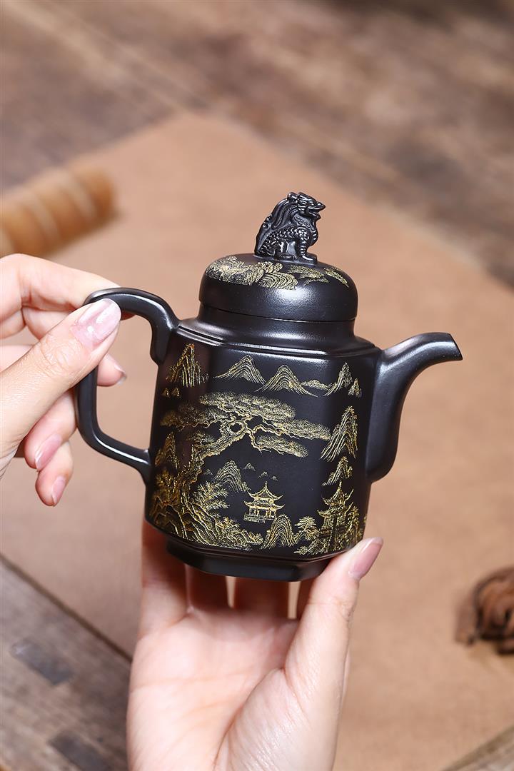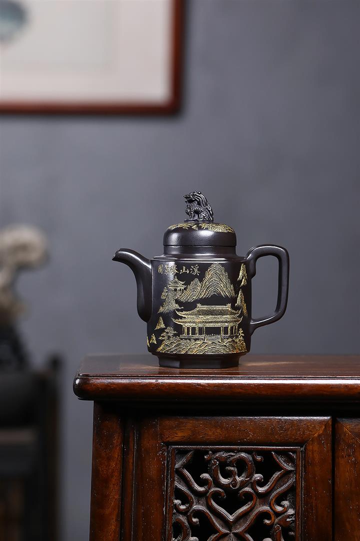 原礦玄鐵石黃六方溪山茶壺POT7579