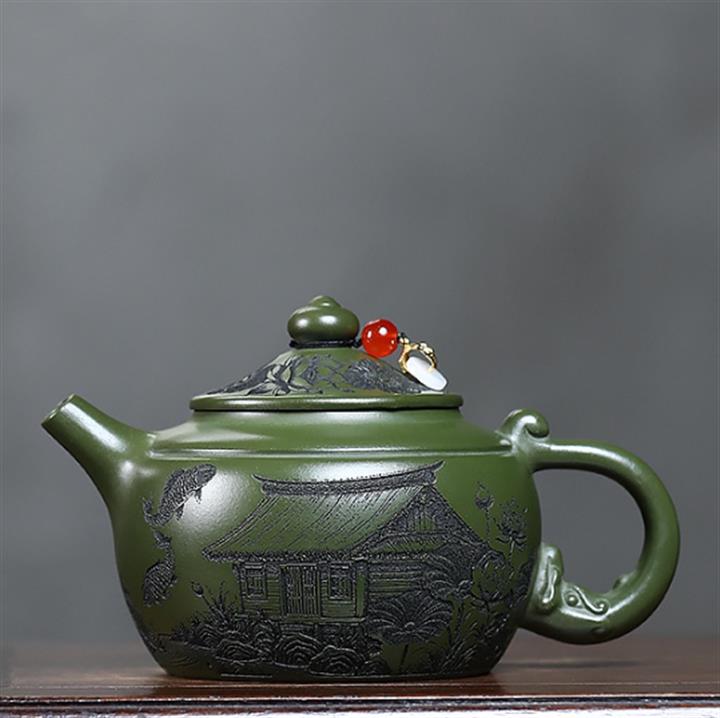 原礦石黃刻繪山水曲茶壺POT7543
