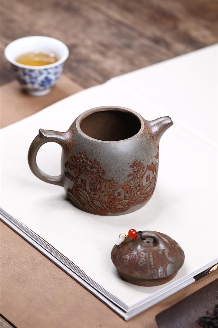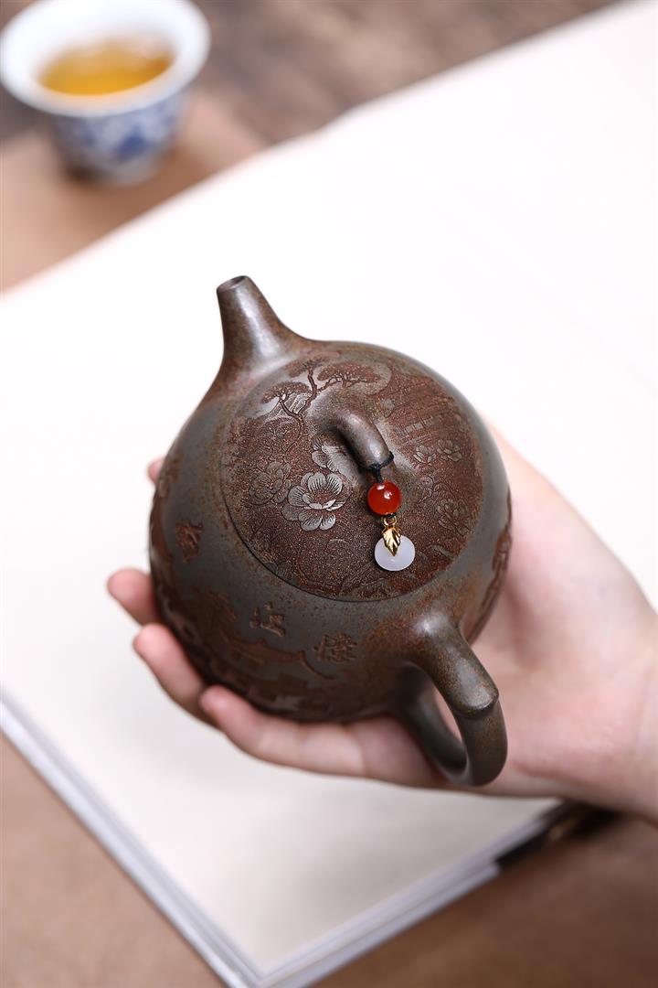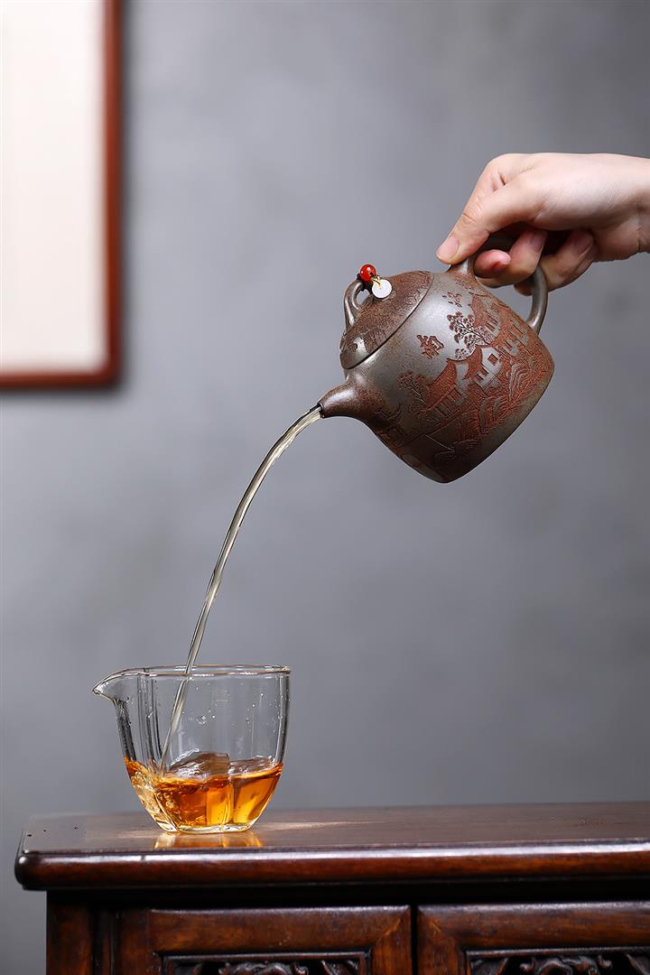 【泥料特點】砂土氣重,似淳實農民,日久使用,漸露鋒芒,養成變化,溫潤莊重。紫砂是壹種雙重氣孔結構的多孔性材質,氣孔微細,密度高。用紫砂壺沏茶,不失原味,且香不渙散,得茶之真香真味。紫砂使用越久,壺身色澤越發光亮照人,氣韻溫雅。紫砂壺長久使用器身會因撫摸擦拭,變得越發溫潤光澤。