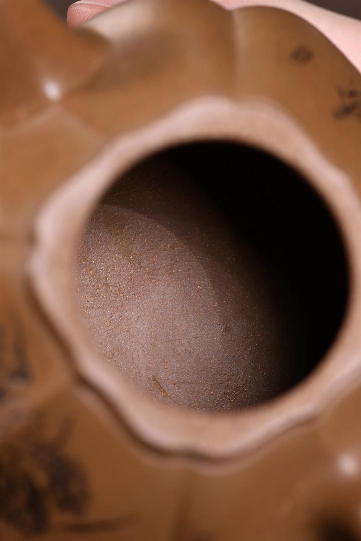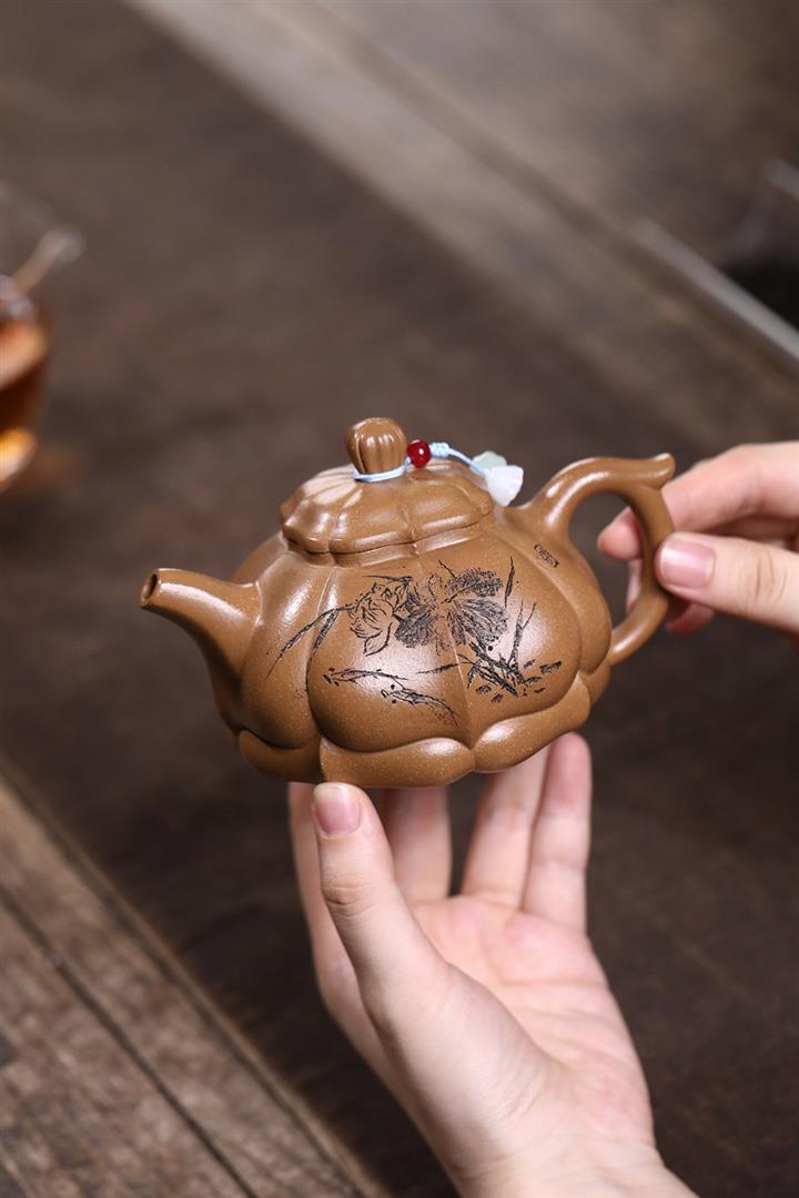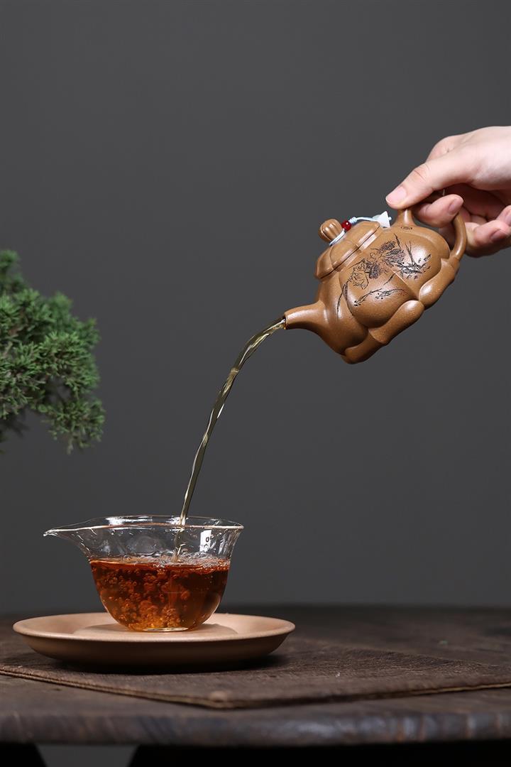 【泥料特點】砂土氣重,似淳實農民,日久使用,漸露鋒芒,養成變化,溫潤莊重。紫砂是壹種雙重氣孔結構的多孔性材質,氣孔微細,密度高。用紫砂壺沏茶,不失原味,且香不渙散,得茶之真香真味。紫砂使用越久,壺身色澤越發光亮照人,氣韻溫雅。紫砂壺長久使用器身會因撫摸擦拭,變得越發溫潤光澤。