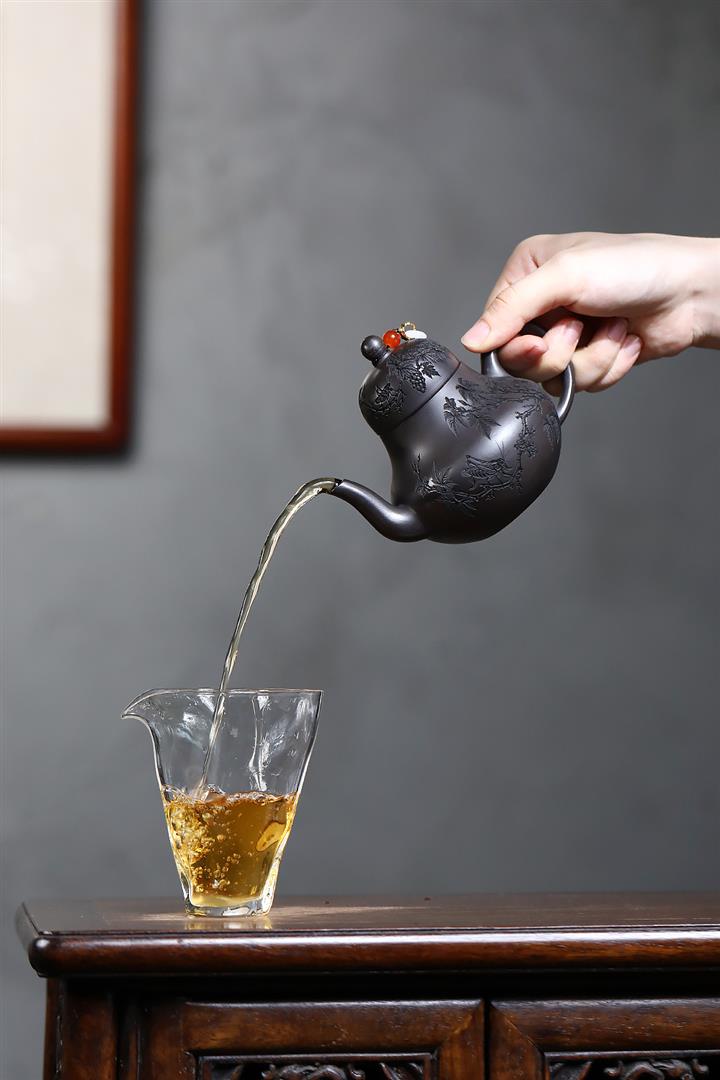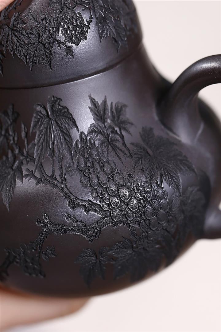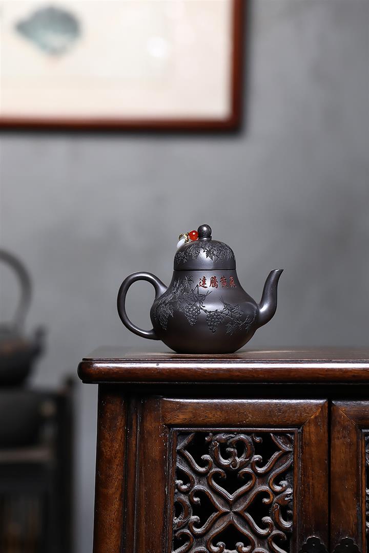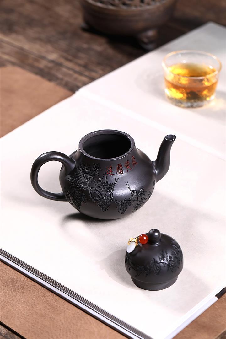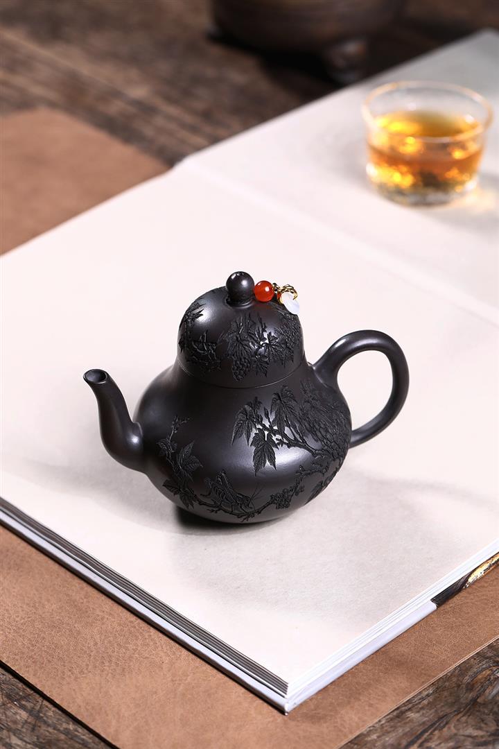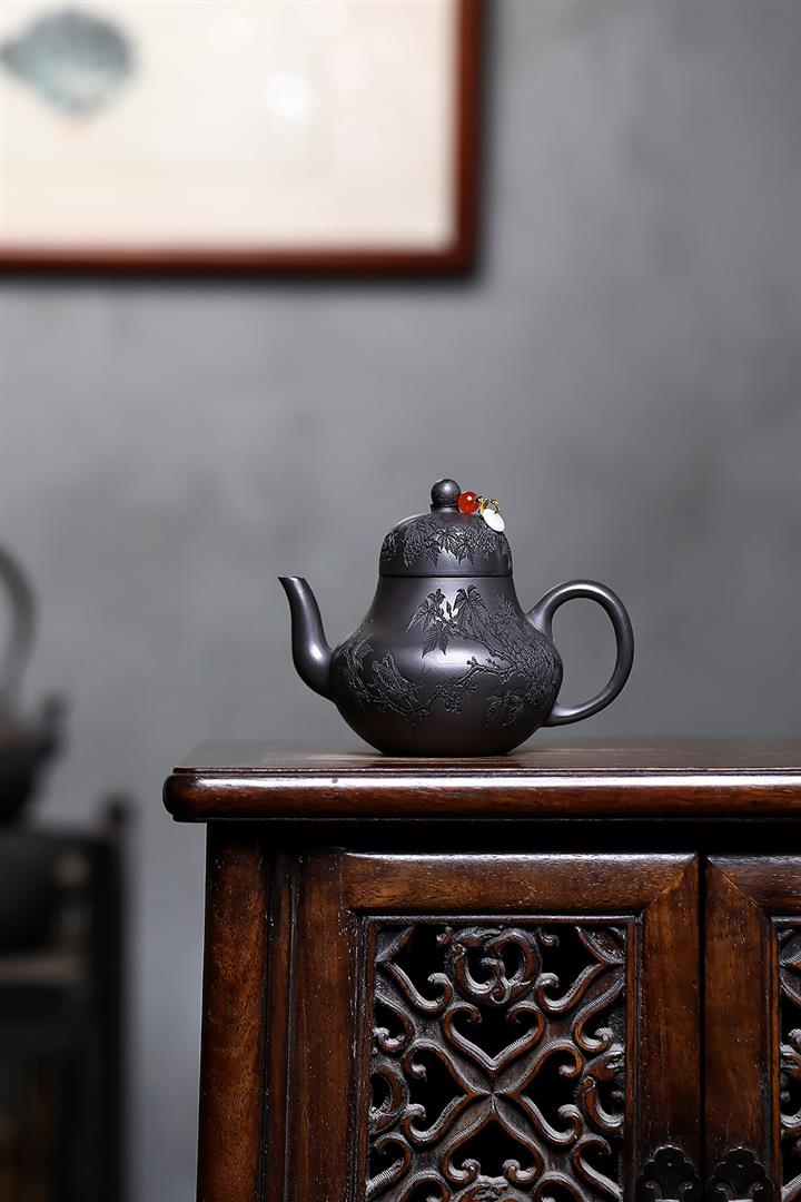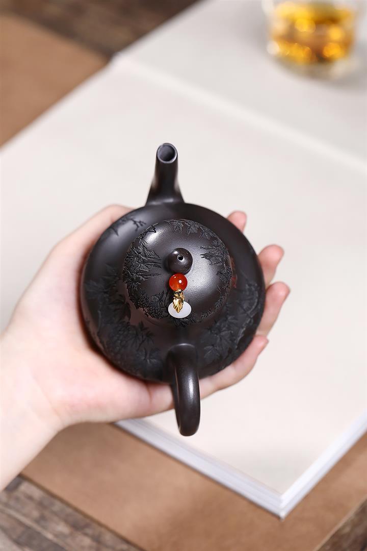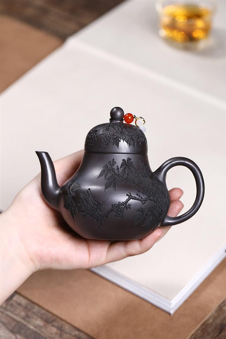 原礦墨綠泥手工滿刻提梁壺POT6720