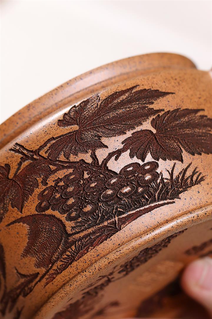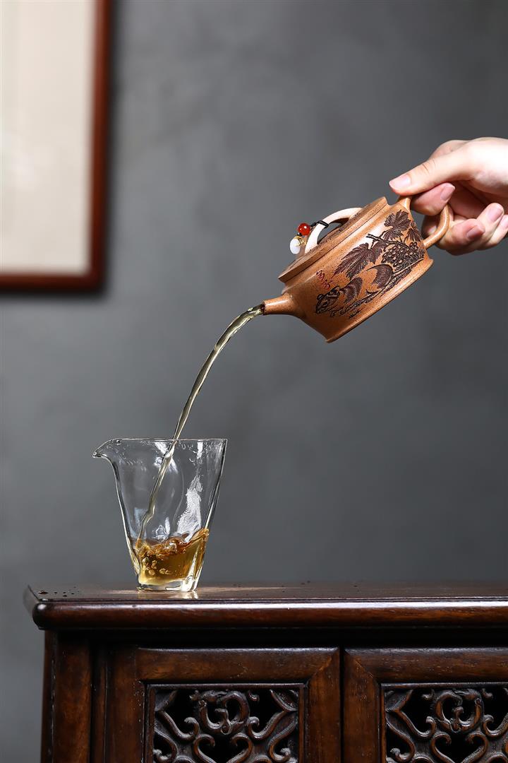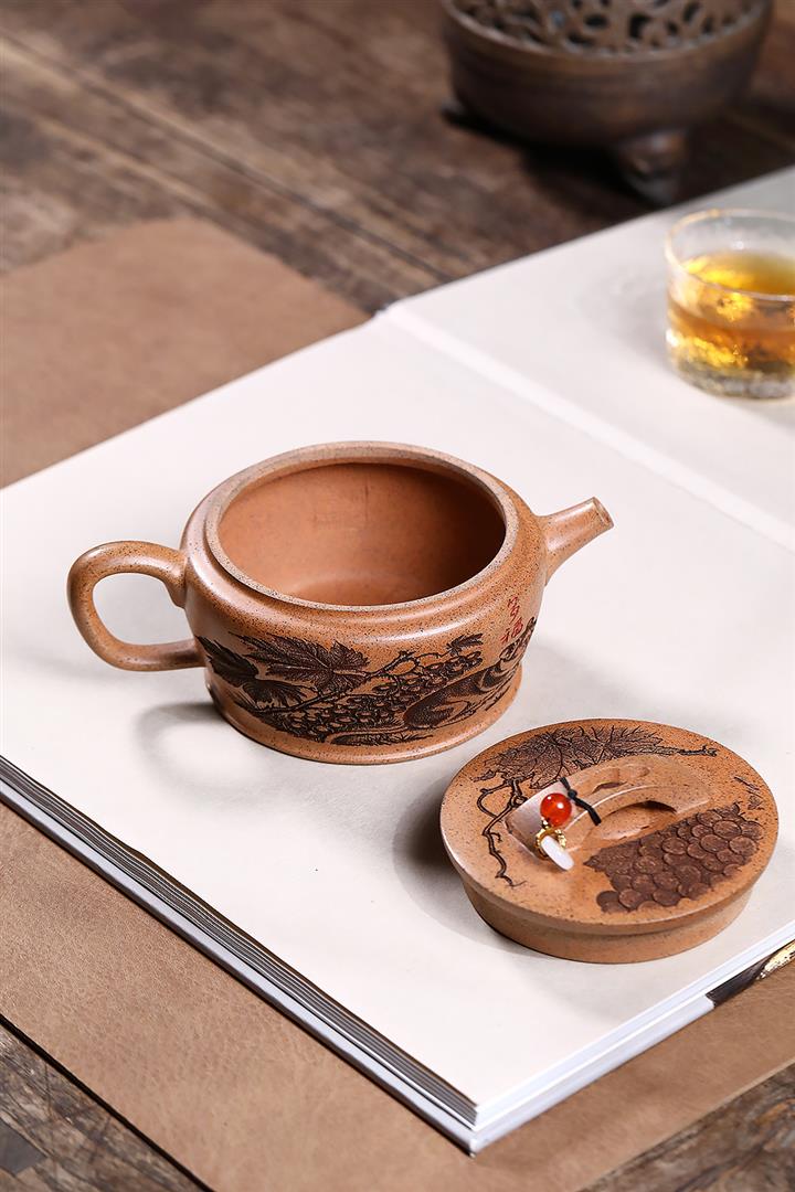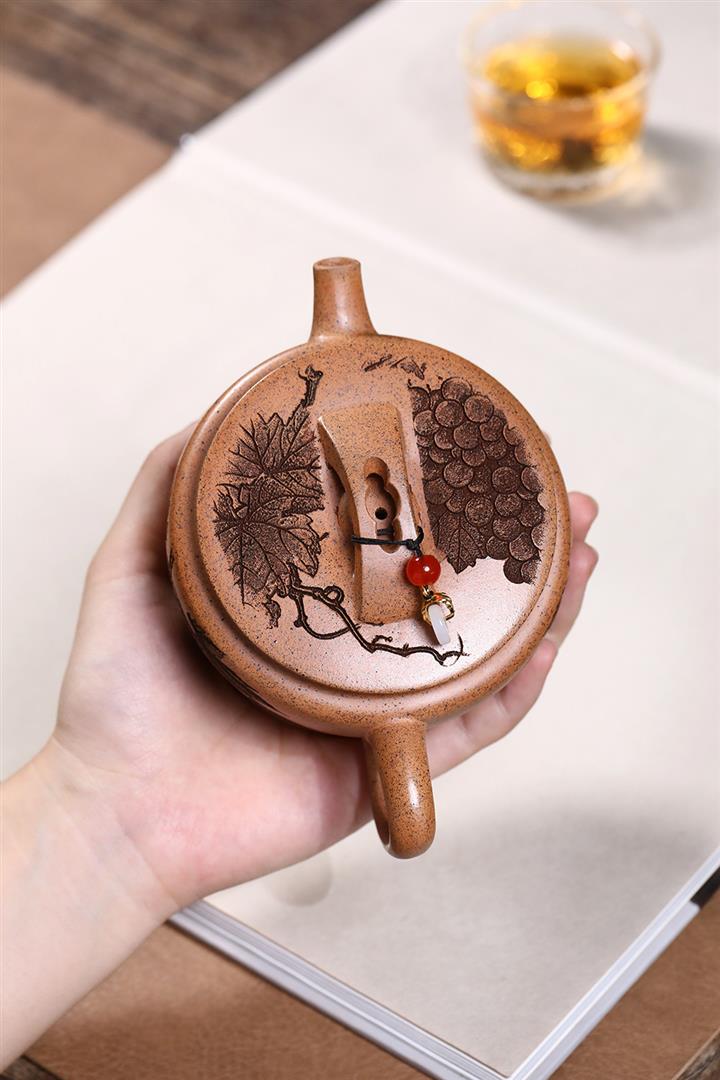 【泥料特點】砂土氣重,似淳實農民,日久使用,漸露鋒芒,養成變化,溫潤莊重。紫砂是壹種雙重氣孔結構的多孔性材質,氣孔微細,密度高。用紫砂壺沏茶,不失原味,且香不渙散,得茶之真香真味。紫砂使用越久,壺身色澤越發光亮照人,氣韻溫雅。紫砂壺長久使用器身會因撫摸擦拭,變得越發溫潤光澤。