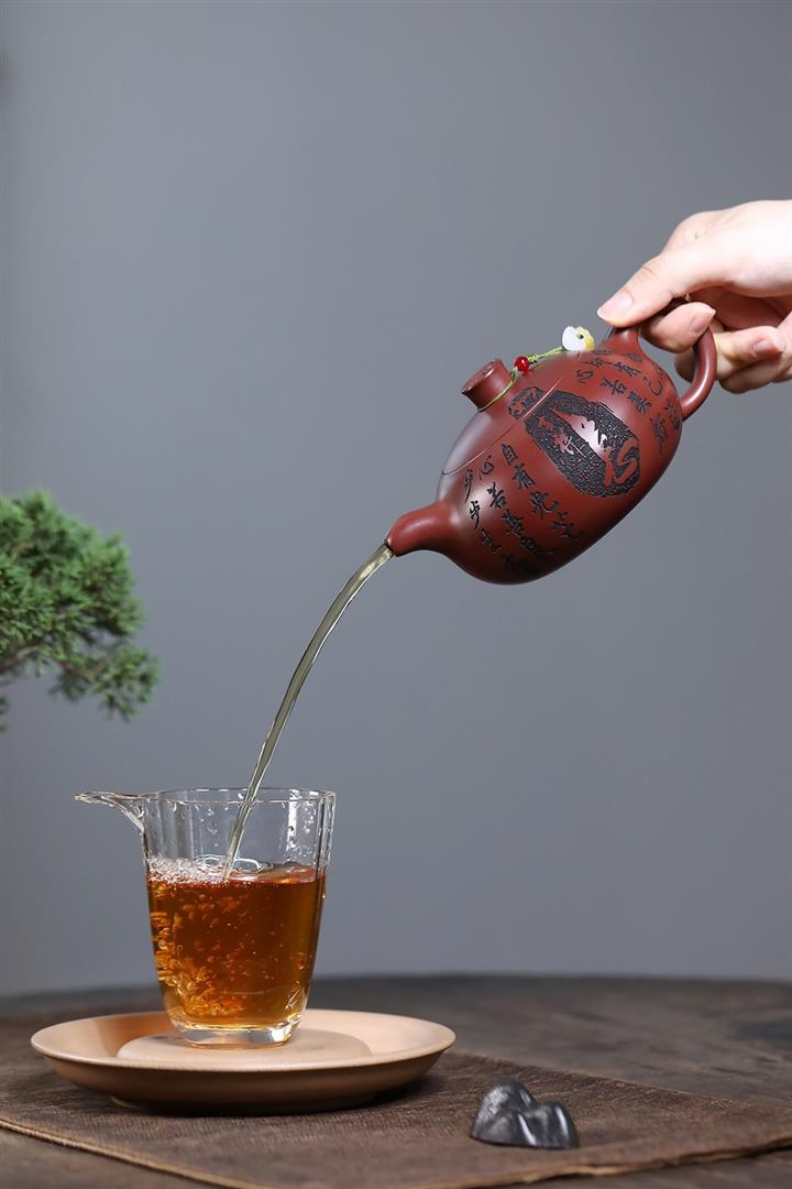 【泥料特點】砂土氣重,似淳實農民,日久使用,漸露鋒芒,養成變化,溫潤莊重。紫砂是壹種雙重氣孔結構的多孔性材質,氣孔微細,密度高。用紫砂壺沏茶,不失原味,且香不渙散,得茶之真香真味。紫砂使用越久,壺身色澤越發光亮照人,氣韻溫雅。紫砂壺長久使用器身會因撫摸擦拭,變得越發溫潤光澤。