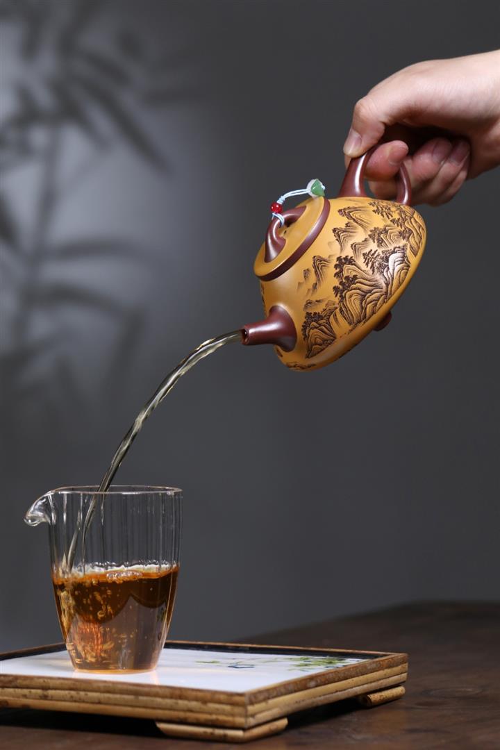 【泥料特點】砂土氣重,似淳實農民,日久使用,漸露鋒芒,養成變化,溫潤莊重。紫砂是壹種雙重氣孔結構的多孔性材質,氣孔微細,密度高。用紫砂壺沏茶,不失原味,且香不渙散,得茶之真香真味。紫砂使用越久,壺身色澤越發光亮照人,氣韻溫雅。紫砂壺長久使用器身會因撫摸擦拭,變得越發溫潤光澤。