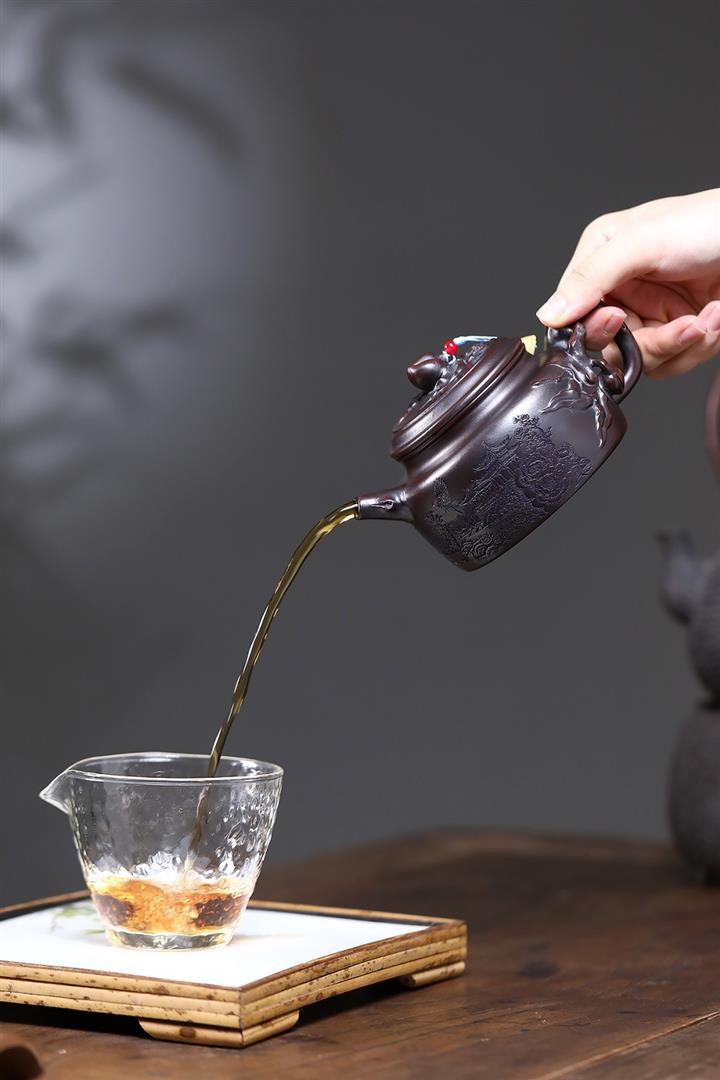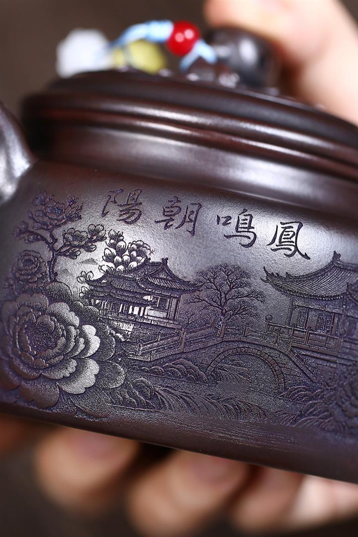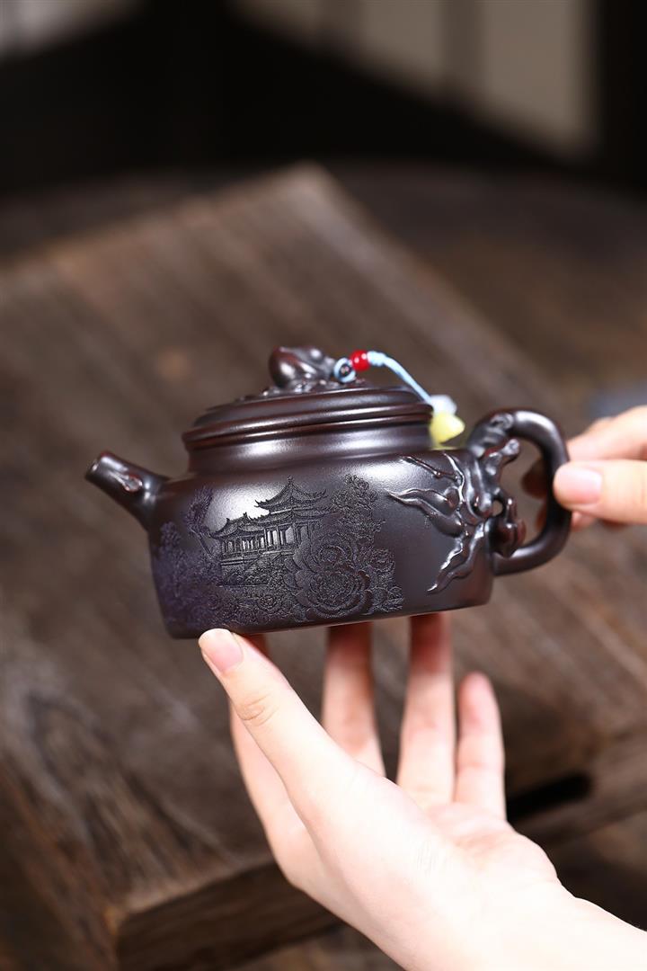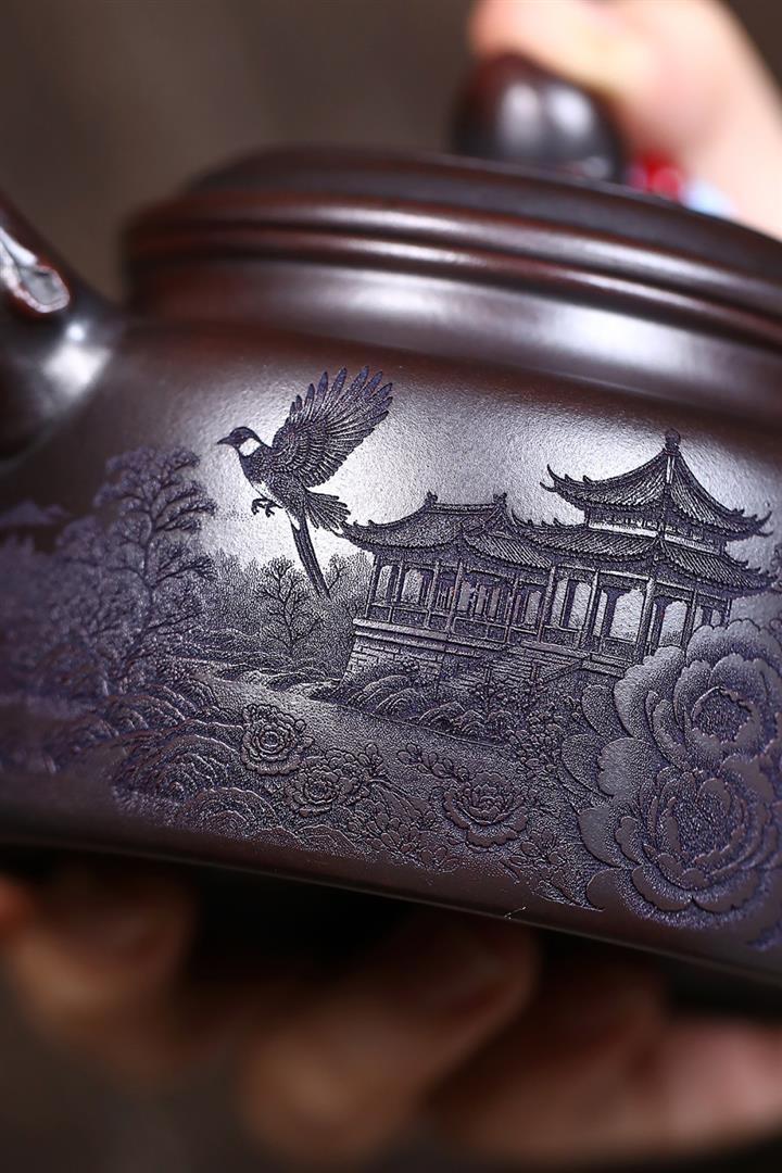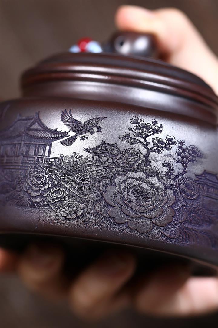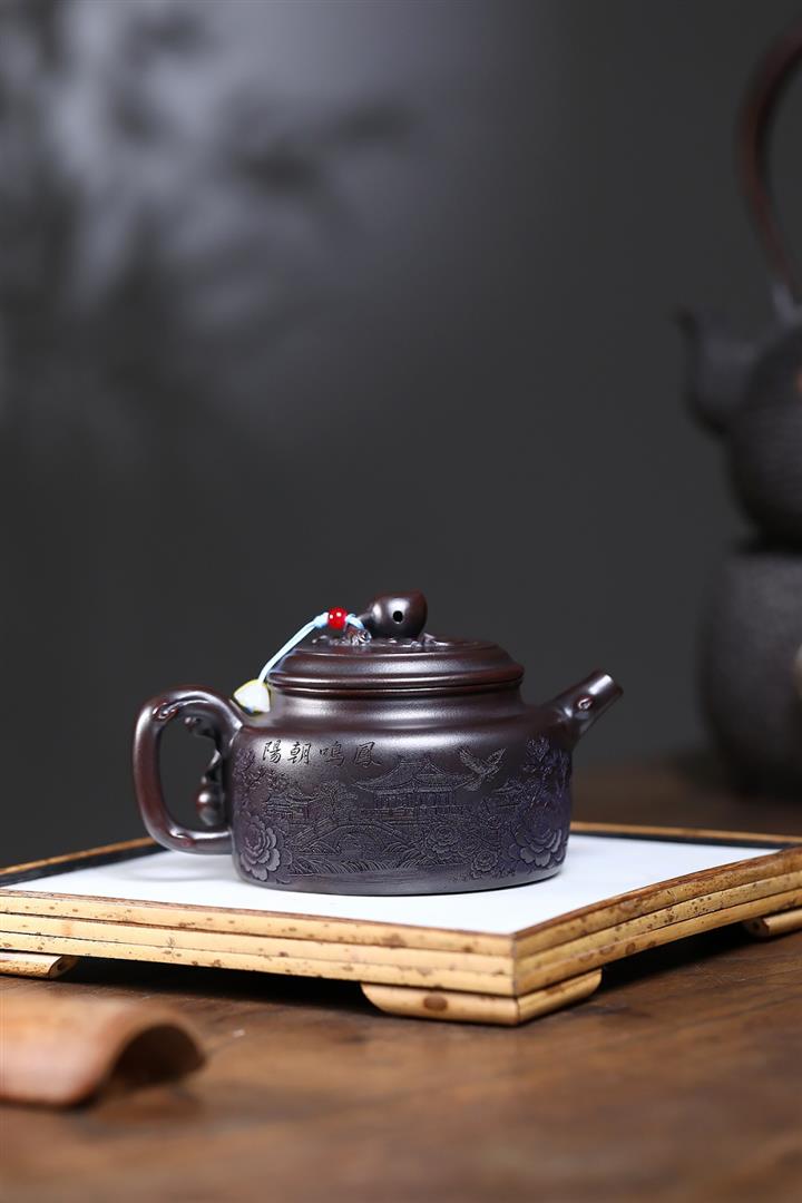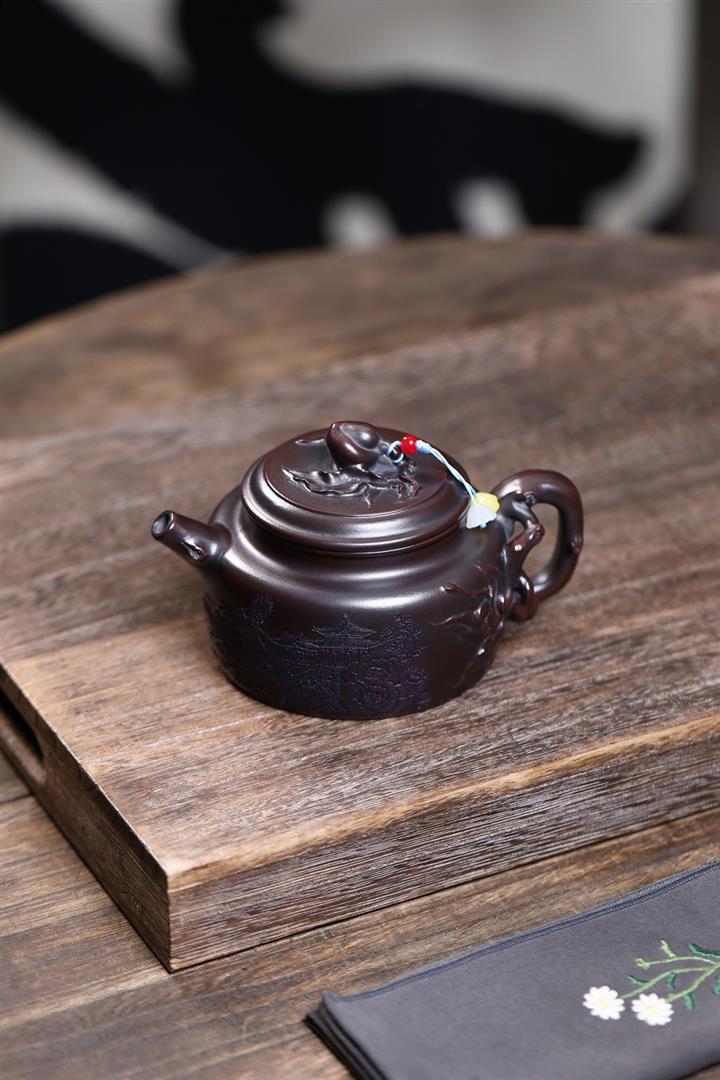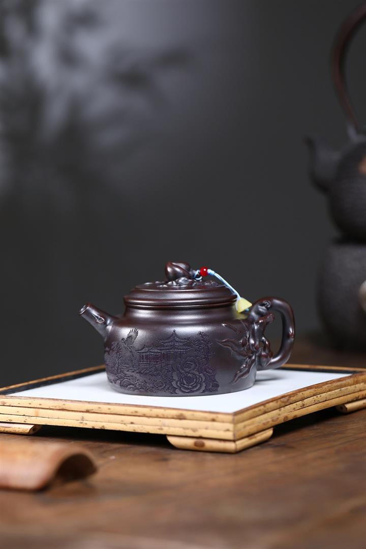 原礦紫砂壺紫泥手工刻繪百福柱礎POT4239
