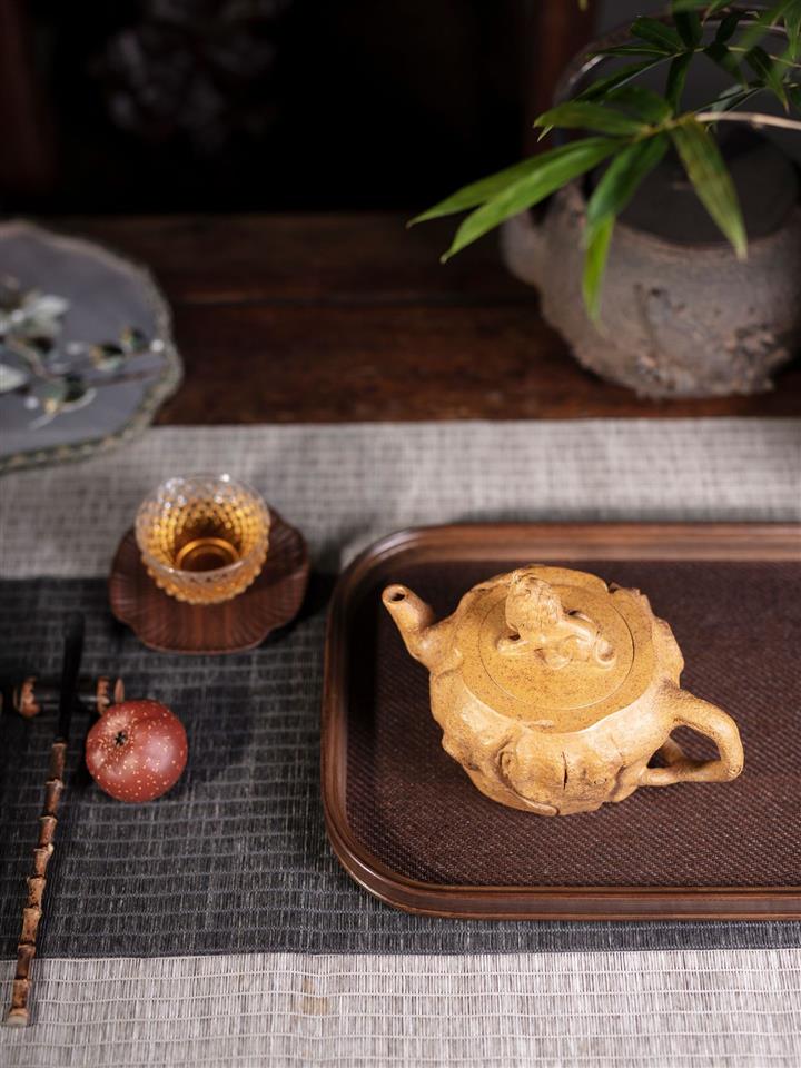 【泥料特點】砂土氣重,似淳實農民,日久使用,漸露鋒芒,養成變化,溫潤莊重。紫砂是壹種雙重氣孔結構的多孔性材質,氣孔微細,密度高。用紫砂壺沏茶,不失原味,且香不渙散,得茶之真香真味。紫砂使用越久,壺身色澤越發光亮照人,氣韻溫雅。紫砂壺長久使用器身會因撫摸擦拭,變得越發溫潤光澤。