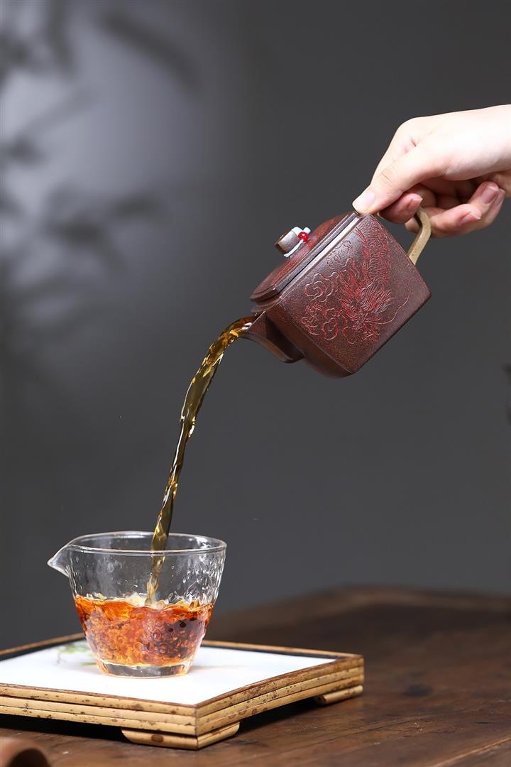 【泥料特點】砂土氣重,似淳實農民,日久使用,漸露鋒芒,養成變化,溫潤莊重。紫砂是壹種雙重氣孔結構的多孔性材質,氣孔微細,密度高。用紫砂壺沏茶,不失原味,且香不渙散,得茶之真香真味。紫砂使用越久,壺身色澤越發光亮照人,氣韻溫雅。紫砂壺長久使用器身會因撫摸擦拭,變得越發溫潤光澤。