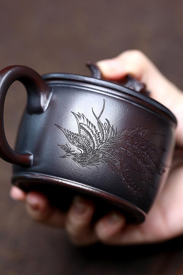 【泥料特點】砂土氣重,似淳實農民,日久使用,漸露鋒芒,養成變化,溫潤莊重。紫砂是壹種雙重氣孔結構的多孔性材質,氣孔微細,密度高。用紫砂壺沏茶,不失原味,且香不渙散,得茶之真香真味。紫砂使用越久,壺身色澤越發光亮照人,氣韻溫雅。紫砂壺長久使用器身會因撫摸擦拭,變得越發溫潤光澤。