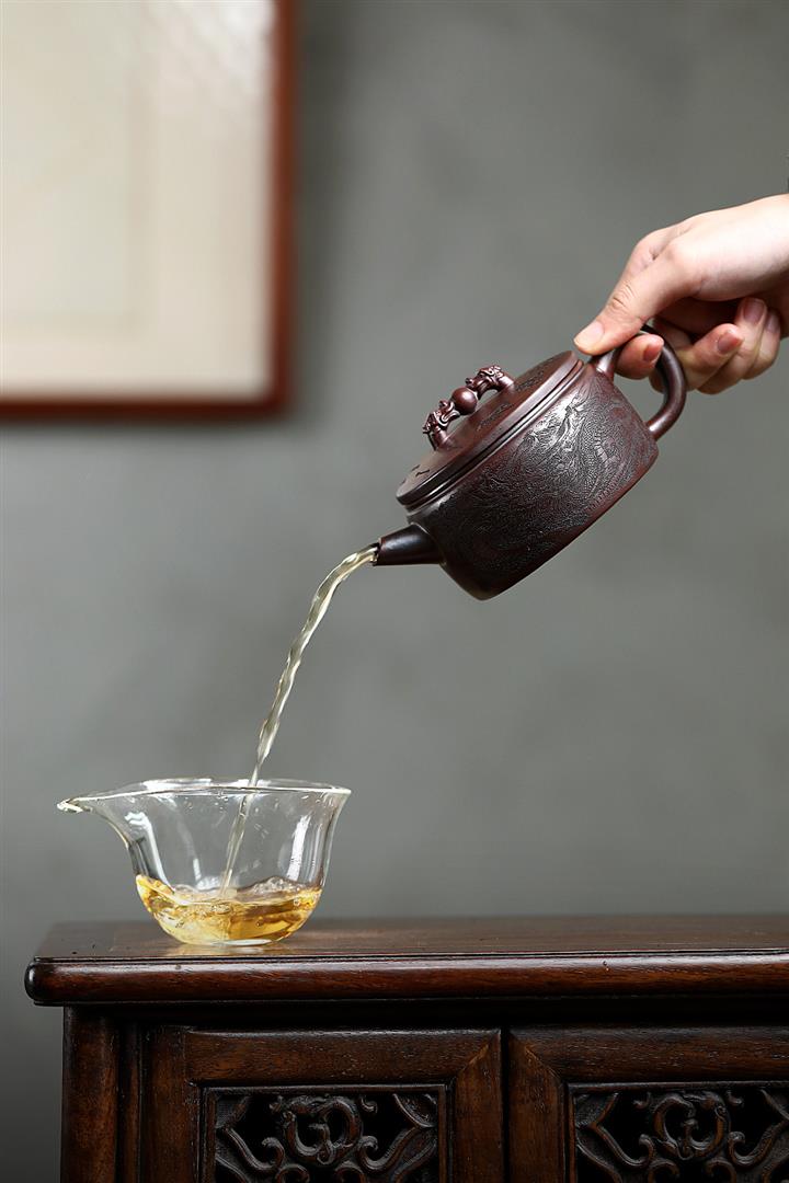 【泥料特點】砂土氣重,似淳實農民,日久使用,漸露鋒芒,養成變化,溫潤莊重。紫砂是壹種雙重氣孔結構的多孔性材質,氣孔微細,密度高。用紫砂壺沏茶,不失原味,且香不渙散,得茶之真香真味。紫砂使用越久,壺身色澤越發光亮照人,氣韻溫雅。紫砂壺長久使用器身會因撫摸擦拭,變得越發溫潤光澤。
