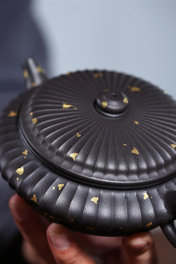 280cc原礦黑料描撒灑金筋紋虛扁茶壺POT8153