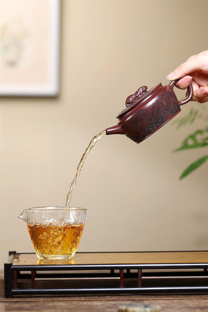 【泥料特點】砂土氣重,似淳實農民,日久使用,漸露鋒芒,養成變化,溫潤莊重。紫砂是壹種雙重氣孔結構的多孔性材質,氣孔微細,密度高。用紫砂壺沏茶,不失原味,且香不渙散,得茶之真香真味。紫砂使用越久,壺身色澤越發光亮照人,氣韻溫雅。紫砂壺長久使用器身會因撫摸擦拭,變得越發溫潤光澤。