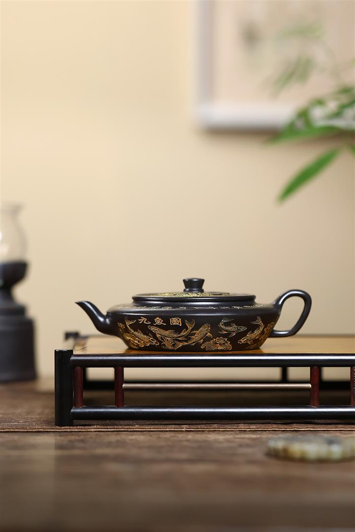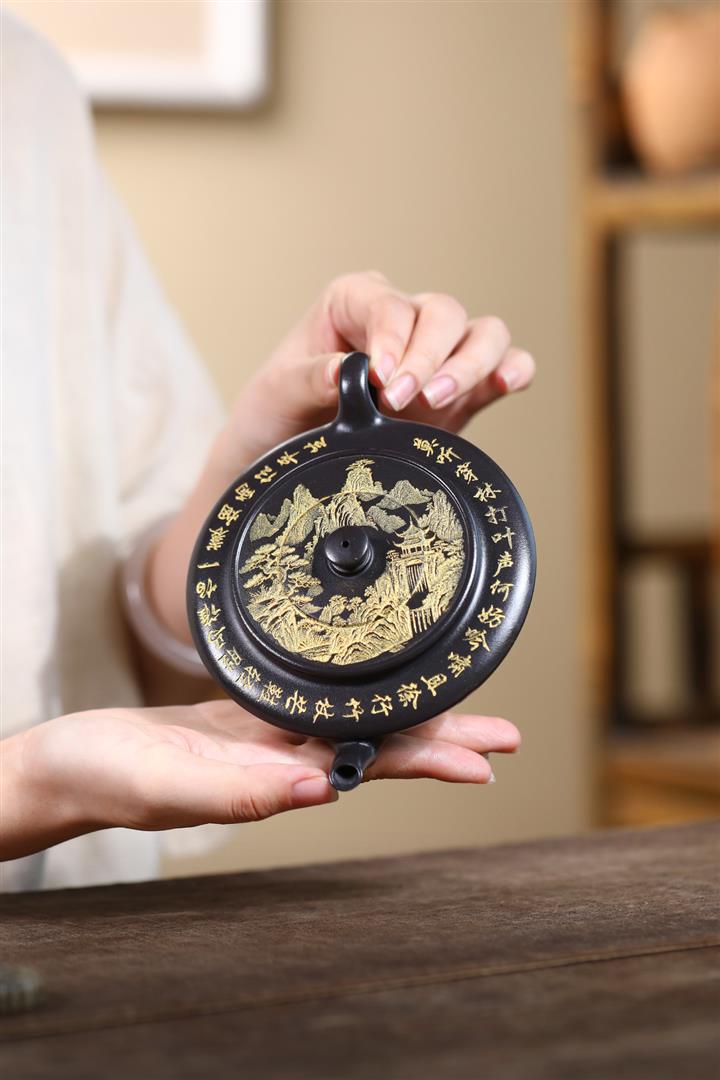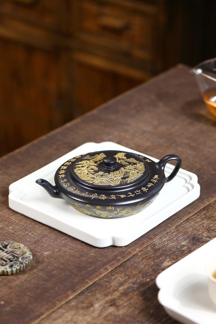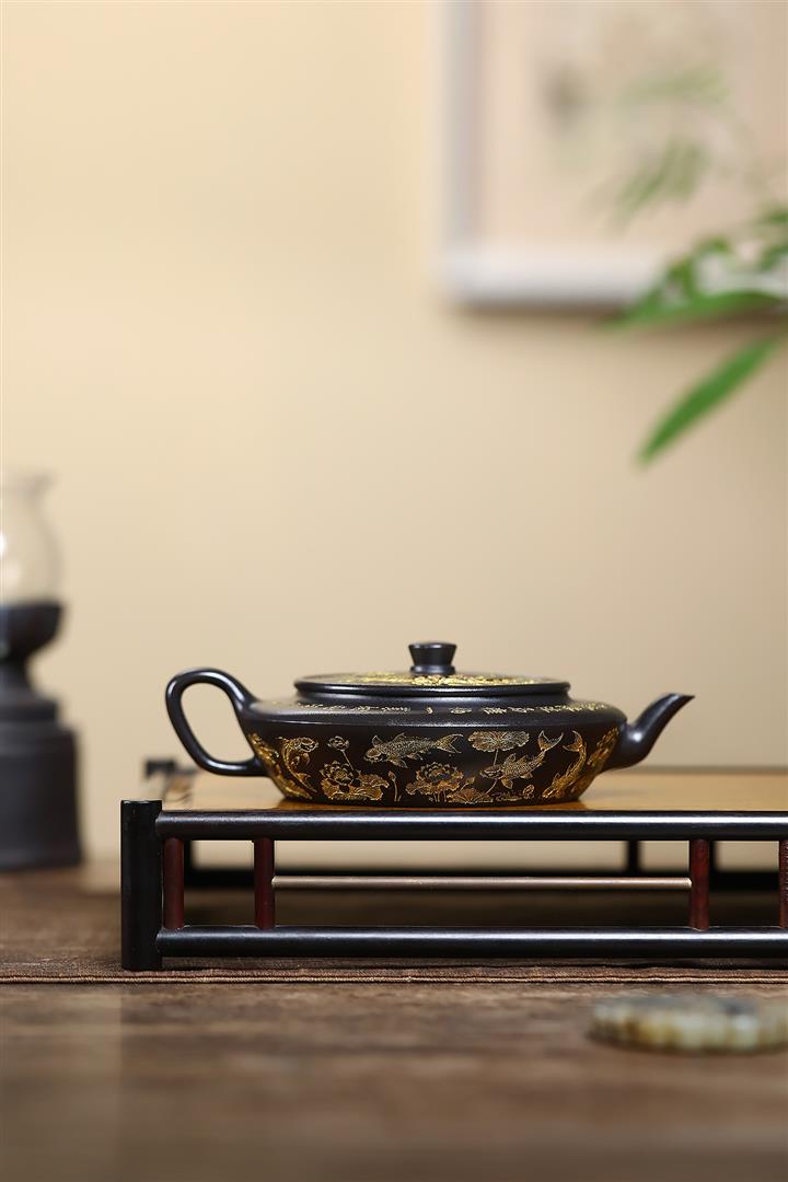 200cc原礦石黃滿身刻繪虛扁扁晨茶壺POT8274
