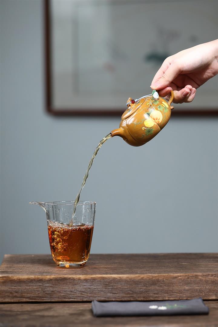 【泥料特點】砂土氣重,似淳實農民,日久使用,漸露鋒芒,養成變化,溫潤莊重。紫砂是壹種雙重氣孔結構的多孔性材質,氣孔微細,密度高。用紫砂壺沏茶,不失原味,且香不渙散,得茶之真香真味。紫砂使用越久,壺身色澤越發光亮照人,氣韻溫雅。紫砂壺長久使用器身會因撫摸擦拭,變得越發溫潤光澤。