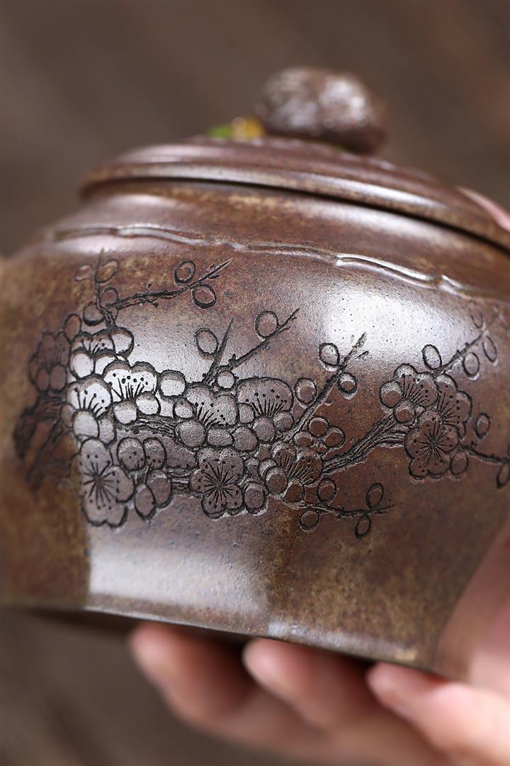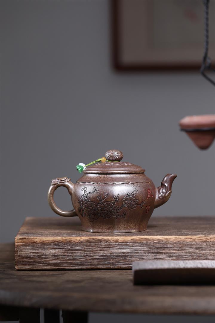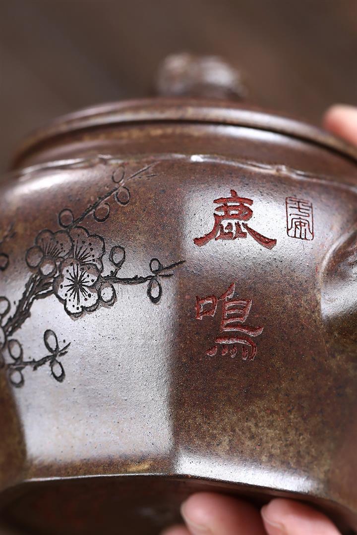 【泥料特點】砂土氣重,似淳實農民,日久使用,漸露鋒芒,養成變化,溫潤莊重。紫砂是壹種雙重氣孔結構的多孔性材質,氣孔微細,密度高。用紫砂壺沏茶,不失原味,且香不渙散,得茶之真香真味。紫砂使用越久,壺身色澤越發光亮照人,氣韻溫雅。紫砂壺長久使用器身會因撫摸擦拭,變得越發溫潤光澤。