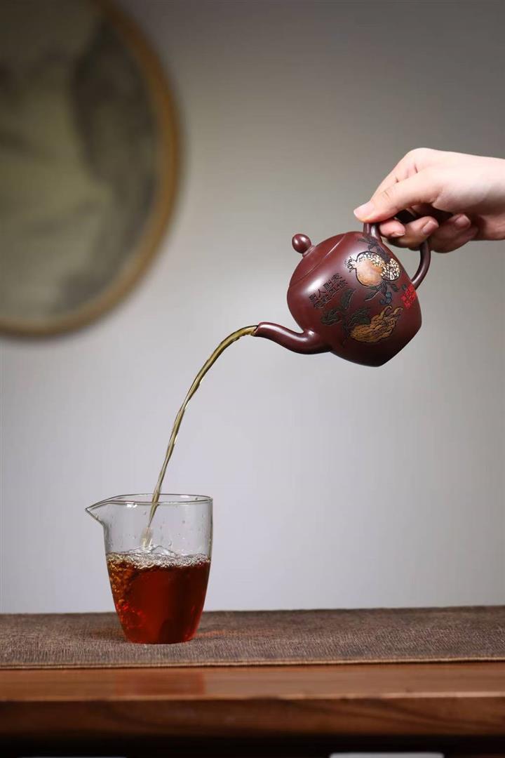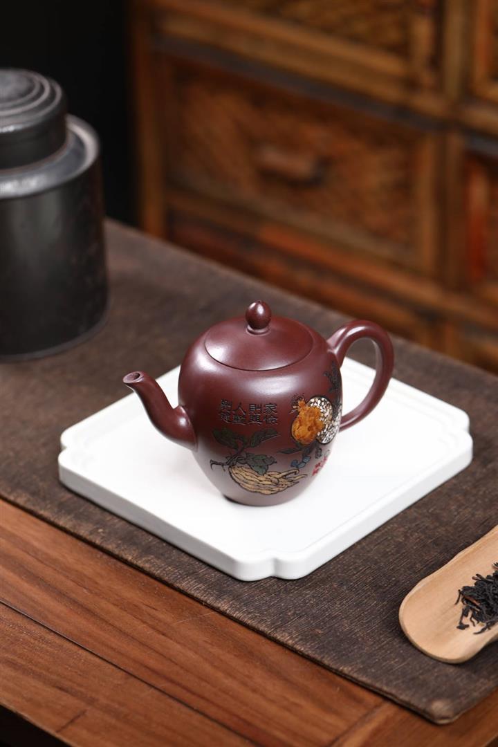 【泥料特點】砂土氣重,似淳實農民,日久使用,漸露鋒芒,養成變化,溫潤莊重。紫砂是壹種雙重氣孔結構的多孔性材質,氣孔微細,密度高。用紫砂壺沏茶,不失原味,且香不渙散,得茶之真香真味。紫砂使用越久,壺身色澤越發光亮照人,氣韻溫雅。紫砂壺長久使用器身會因撫摸擦拭,變得越發溫潤光澤。