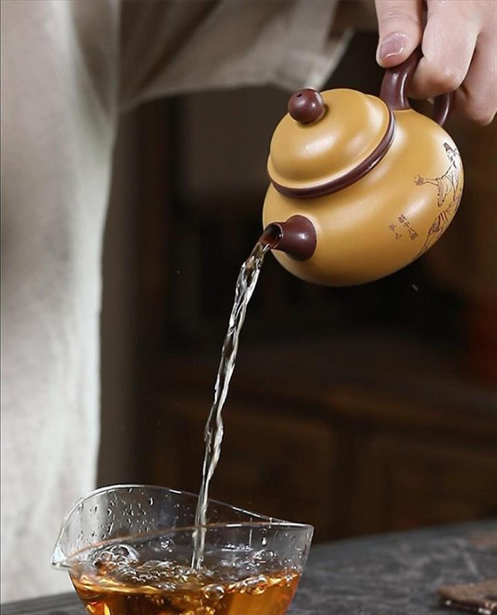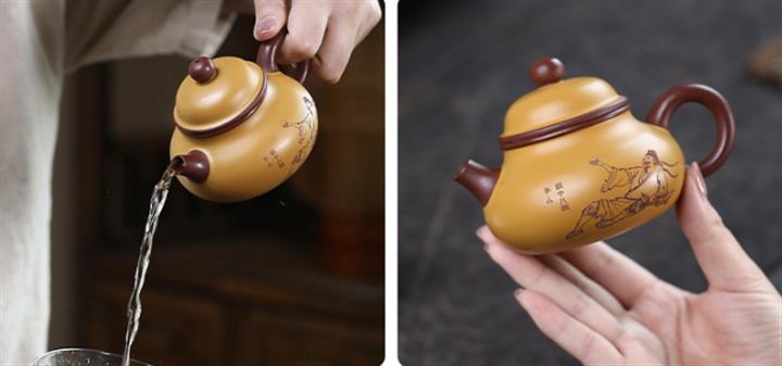 【泥料特點】砂土氣重,似淳實農民,日久使用,漸露鋒芒,養成變化,溫潤莊重。紫砂是壹種雙重氣孔結構的多孔性材質,氣孔微細,密度高。用紫砂壺沏茶,不失原味,且香不渙散,得茶之真香真味。紫砂使用越久,壺身色澤越發光亮照人,氣韻溫雅。紫砂壺長久使用器身會因撫摸擦拭,變得越發溫潤光澤。