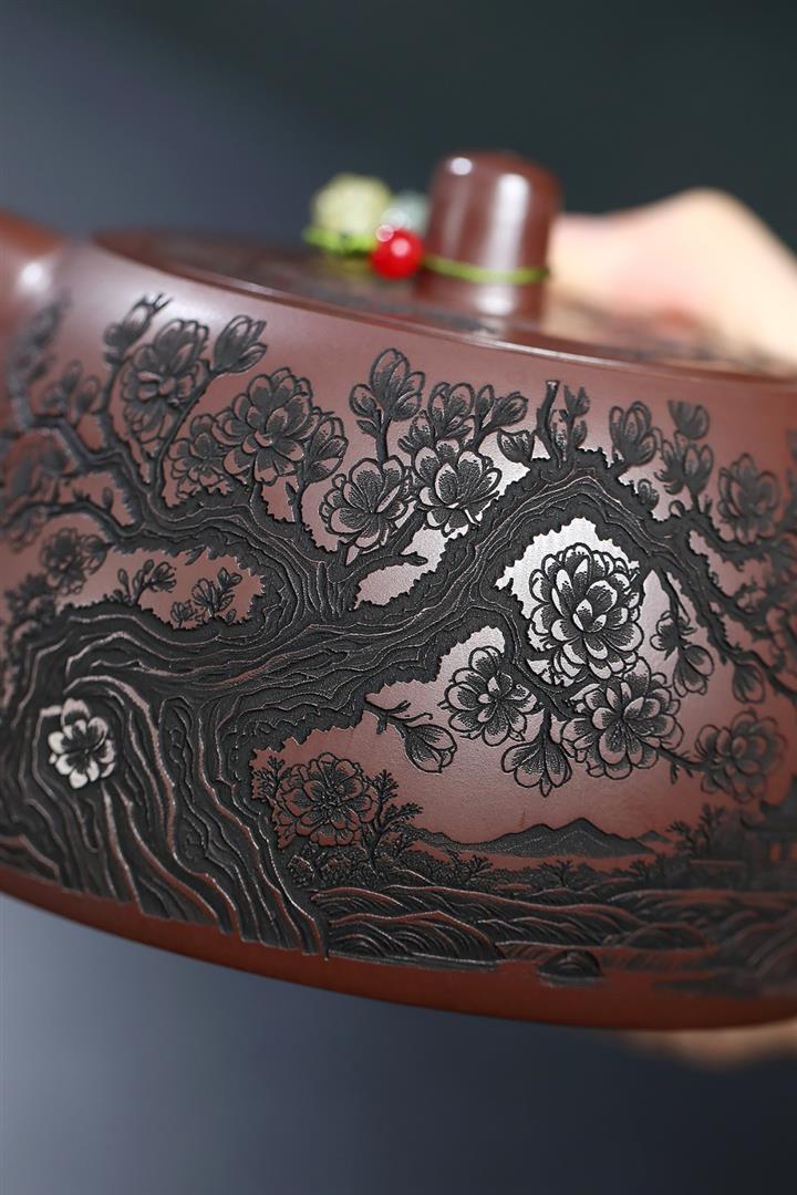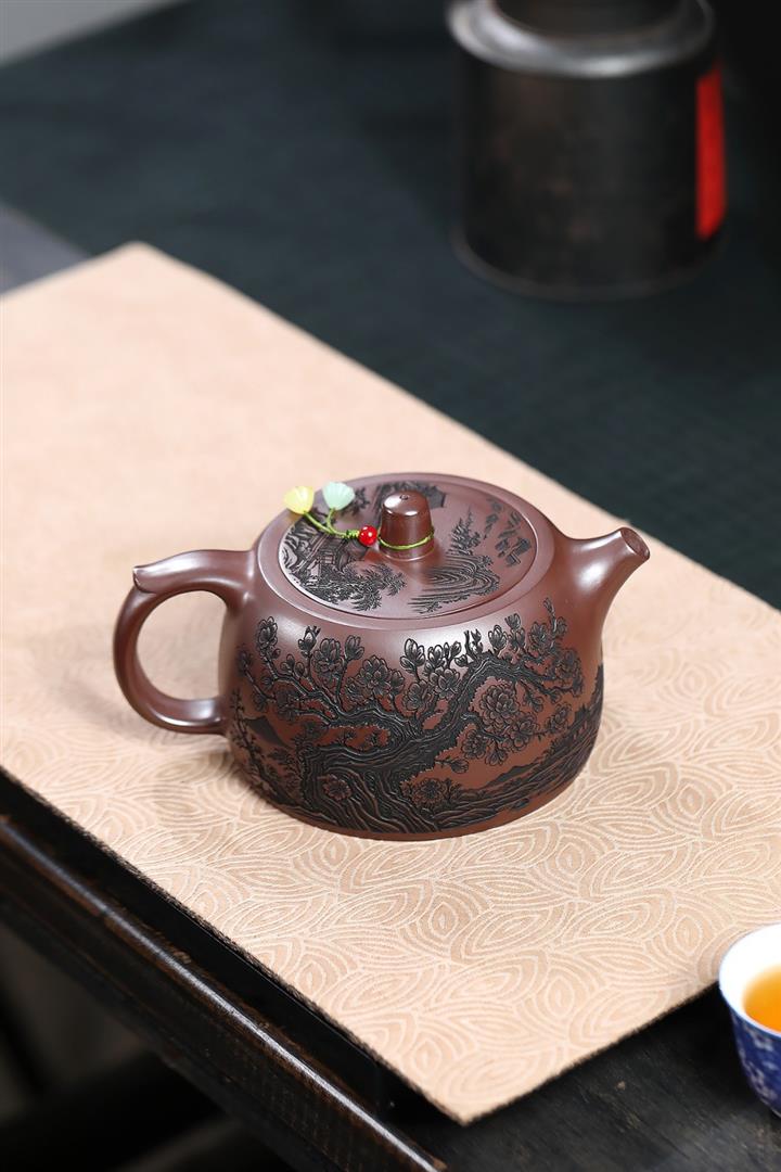 【泥料特點】砂土氣重,似淳實農民,日久使用,漸露鋒芒,養成變化,溫潤莊重。紫砂是壹種雙重氣孔結構的多孔性材質,氣孔微細,密度高。用紫砂壺沏茶,不失原味,且香不渙散,得茶之真香真味。紫砂使用越久,壺身色澤越發光亮照人,氣韻溫雅。紫砂壺長久使用器身會因撫摸擦拭,變得越發溫潤光澤。