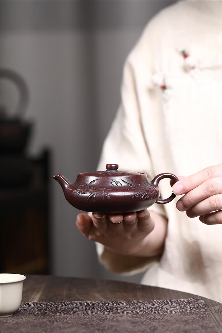 【作品介紹】此款壺形線條流暢,壺把,壺嘴,壺身壹氣呵成栩栩如生,是收藏把玩的好壺,泥料色澤古樸典雅,日久使用,漸露鋒芒,養成變化快,溫潤莊重,用其泡茶,使用的年代久,壺身就溫潤,泡出來的茶湯也就醇郁芳馨。