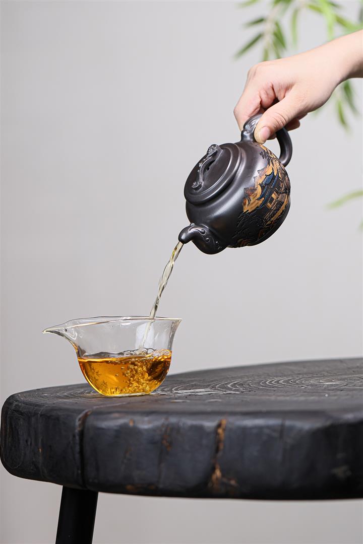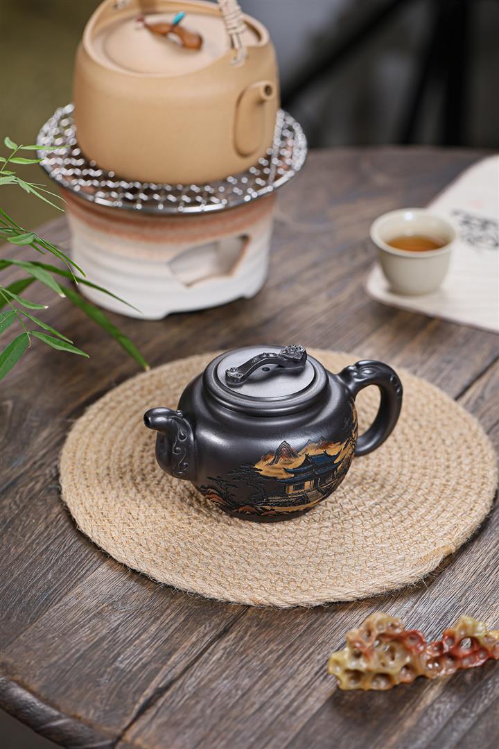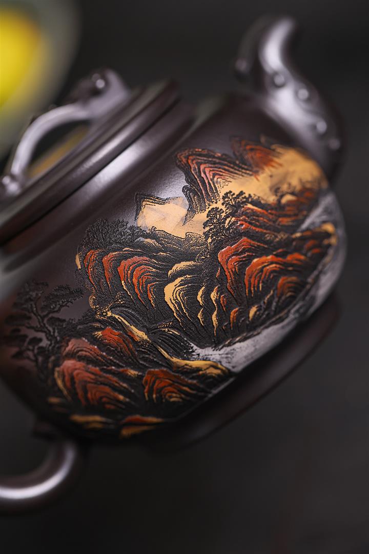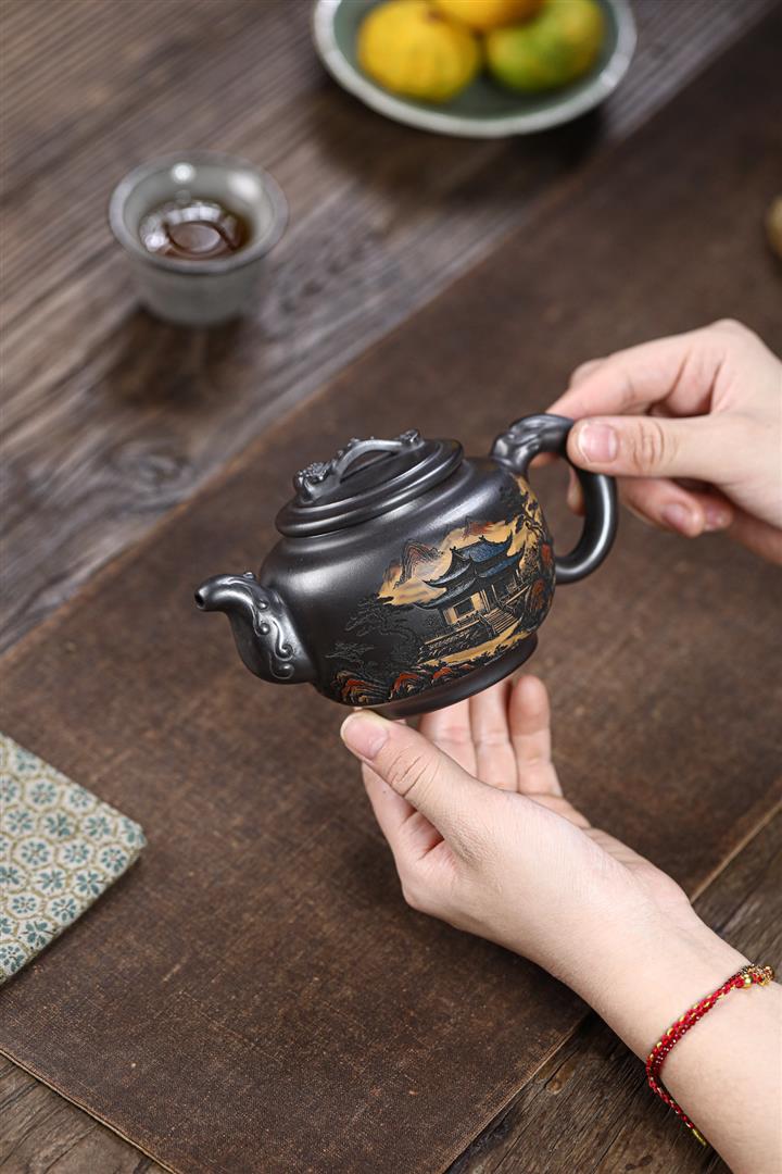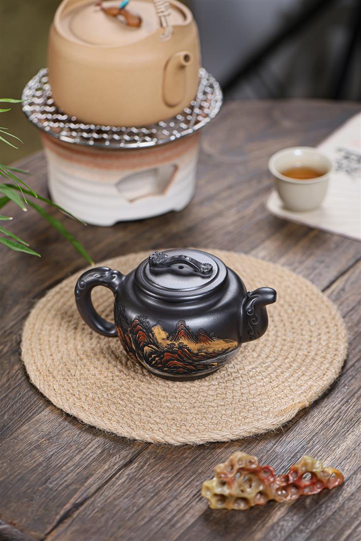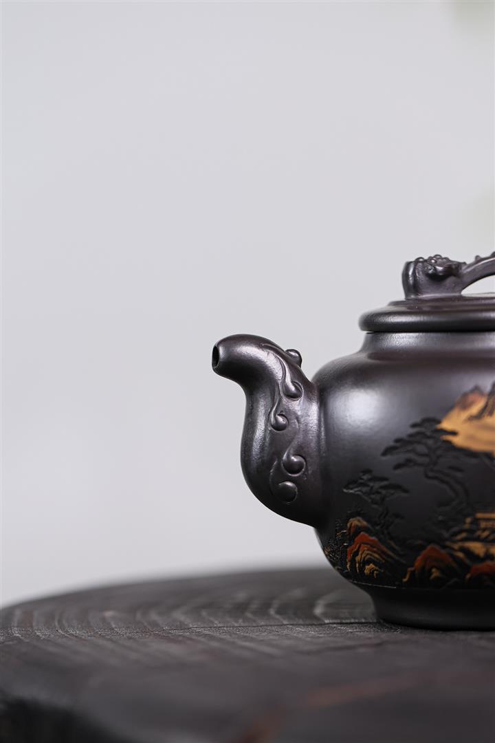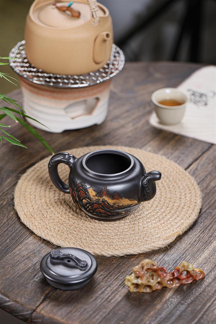 原礦墨綠泥手工滿刻觀山洋桶茶壺POT7107