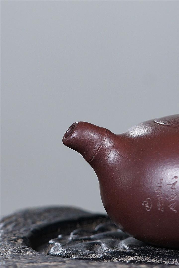 【泥料特點】砂土氣重,似淳實農民,日久使用,漸露鋒芒,養成變化,溫潤莊重。紫砂是壹種雙重氣孔結構的多孔性材質,氣孔微細,密度高。用紫砂壺沏茶,不失原味,且香不渙散,得茶之真香真味。紫砂使用越久,壺身色澤越發光亮照人,氣韻溫雅。紫砂壺長久使用器身會因撫摸擦拭,變得越發溫潤光澤。