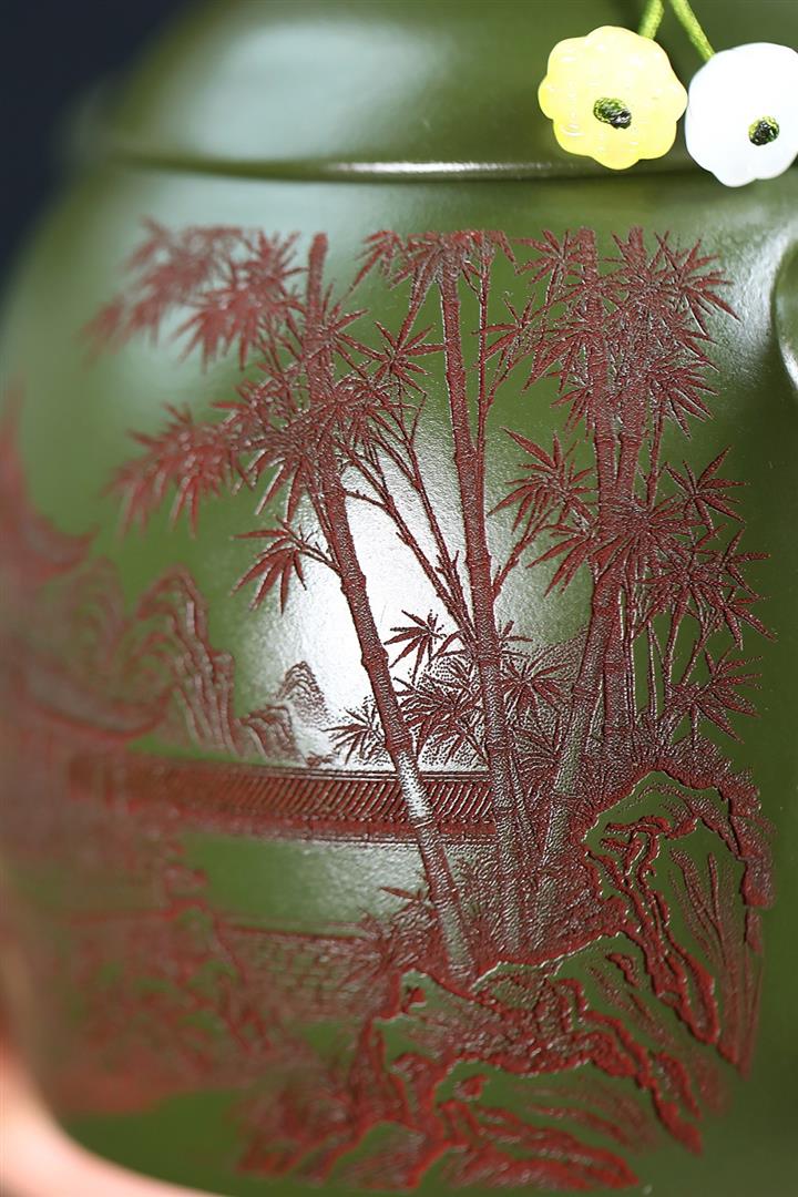 380cc原礦綠泥滿刻竹林松濤秦權茶壺POT9085