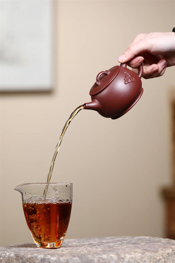 【泥料特點】砂土氣重,似淳實農民,日久使用,漸露鋒芒,養成變化,溫潤莊重。紫砂是壹種雙重氣孔結構的多孔性材質,氣孔微細,密度高。用紫砂壺沏茶,不失原味,且香不渙散,得茶之真香真味。紫砂使用越久,壺身色澤越發光亮照人,氣韻溫雅。紫砂壺長久使用器身會因撫摸擦拭,變得越發溫潤光澤。