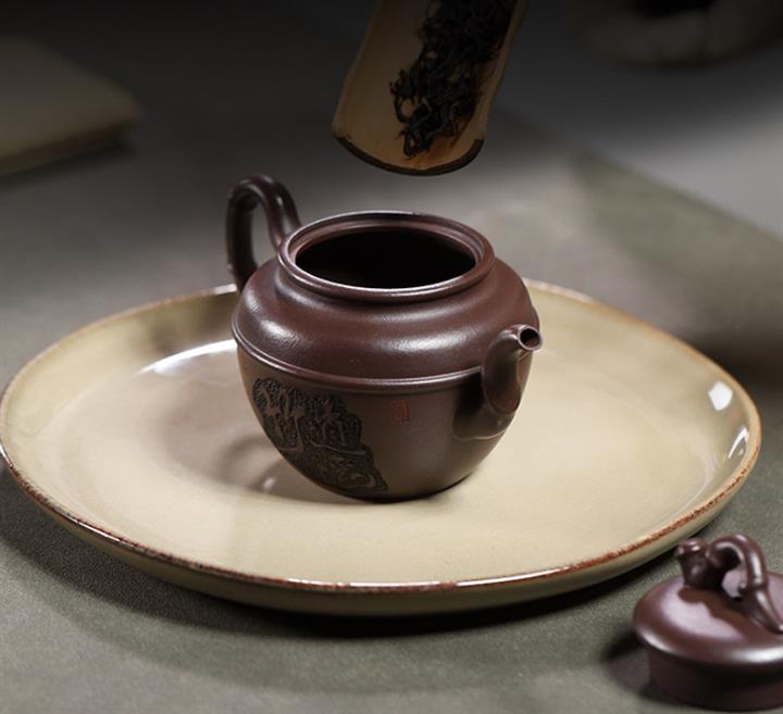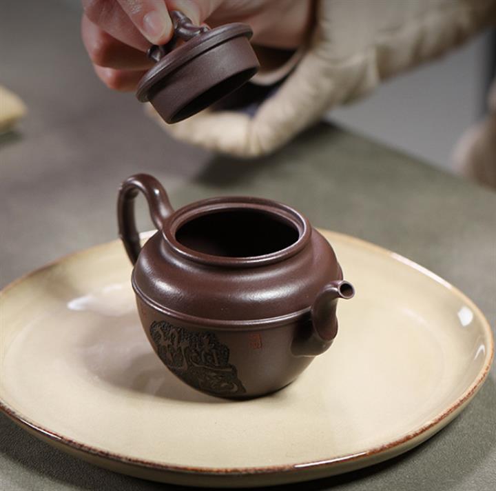 【泥料特點】砂土氣重,似淳實農民,日久使用,漸露鋒芒,養成變化,溫潤莊重。紫砂是壹種雙重氣孔結構的多孔性材質,氣孔微細,密度高。用紫砂壺沏茶,不失原味,且香不渙散,得茶之真香真味。紫砂使用越久,壺身色澤越發光亮照人,氣韻溫雅。紫砂壺長久使用器身會因撫摸擦拭,變得越發溫潤光澤。