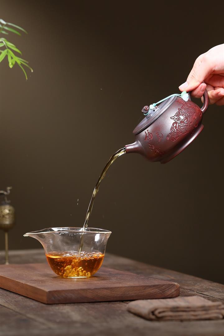 【泥料特點】砂土氣重,似淳實農民,日久使用,漸露鋒芒,養成變化,溫潤莊重。紫砂是壹種雙重氣孔結構的多孔性材質,氣孔微細,密度高。用紫砂壺沏茶,不失原味,且香不渙散,得茶之真香真味。紫砂使用越久,壺身色澤越發光亮照人,氣韻溫雅。紫砂壺長久使用器身會因撫摸擦拭,變得越發溫潤光澤。