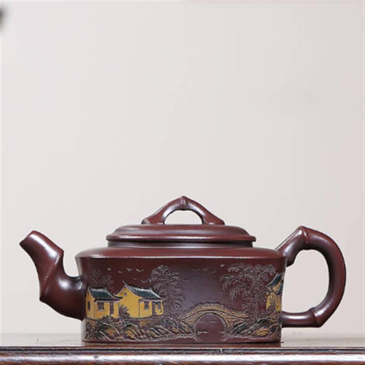 240cc龍山古烏泥彩刻山水四方竹段茶壺POT9014