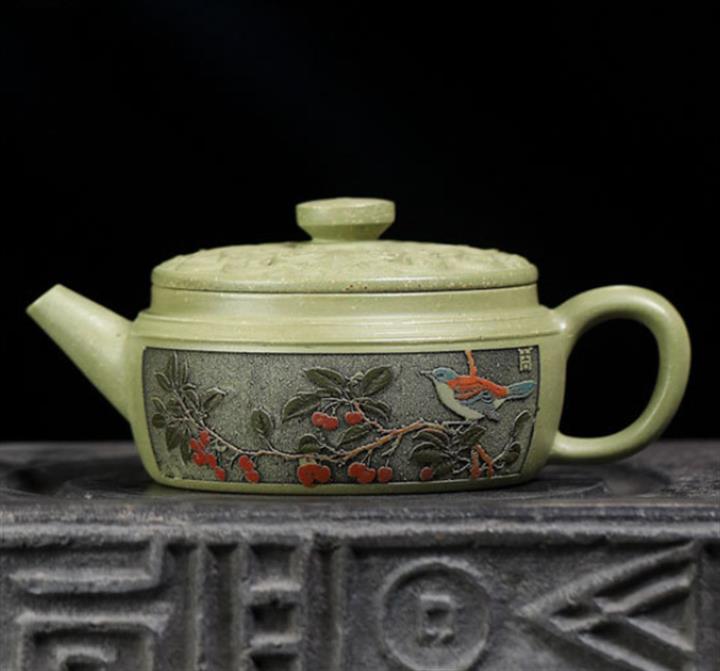 200cc原礦豆青砂櫻枝載福泡茶壺POT9783
