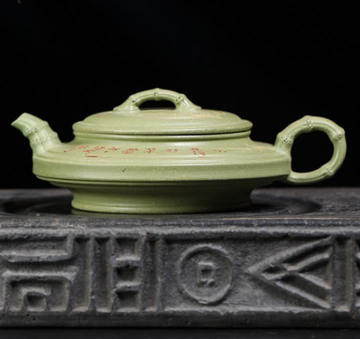 180cc原礦豆青砂竹刻虛扁泡茶壺POT9784
