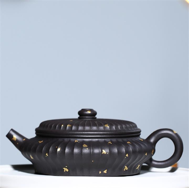 280cc原礦黑料描撒灑金筋紋虛扁泡茶壺POT9934