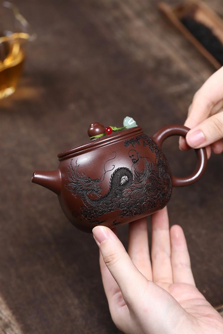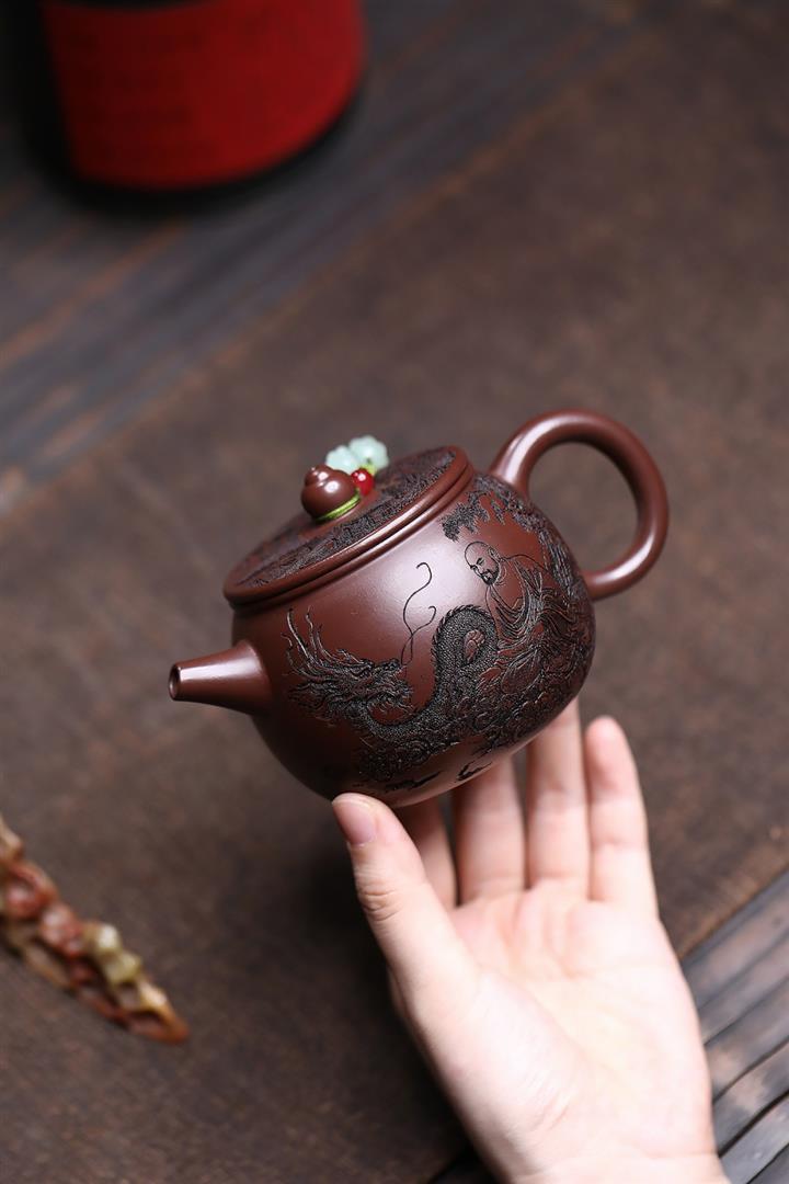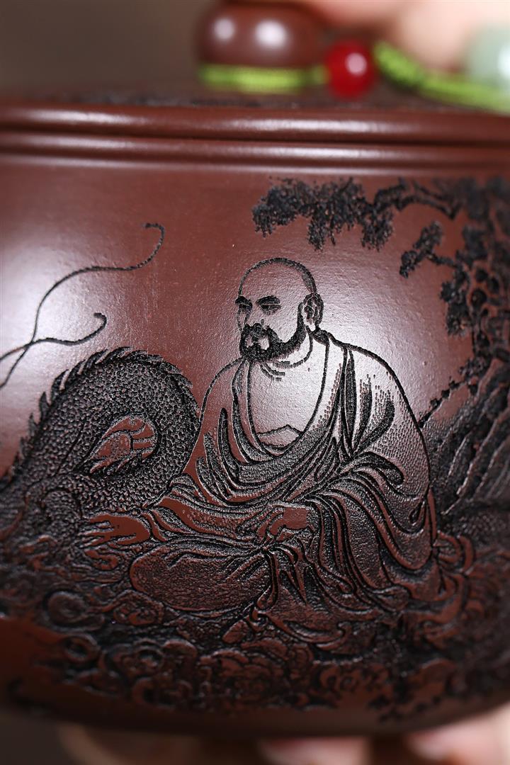 原礦陳腐紫泥滿刻羅漢漢瓦壺POT7641