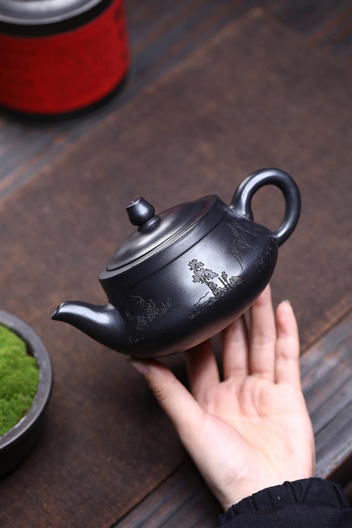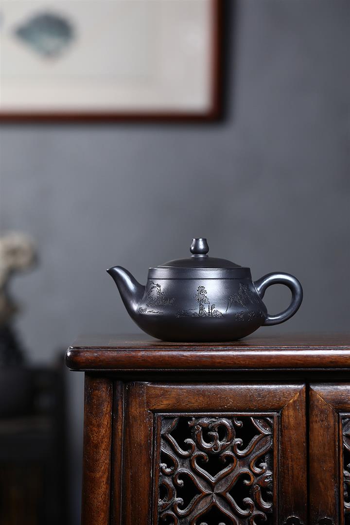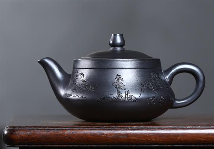 原礦石黃刻繪山水曲壺茶壺POT7683