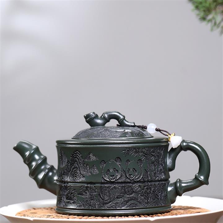 260cc原礦綠泥滿刻熊貓竹段茶壺POT8073