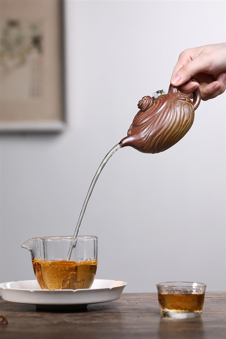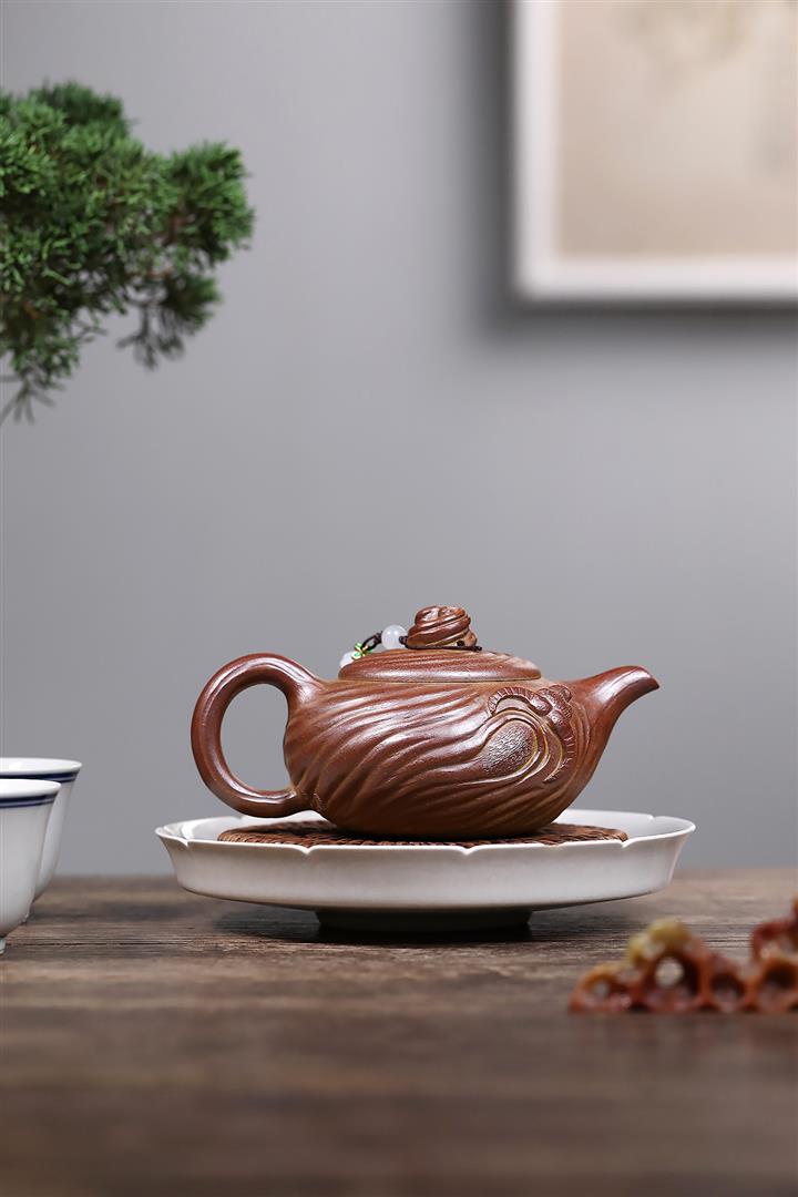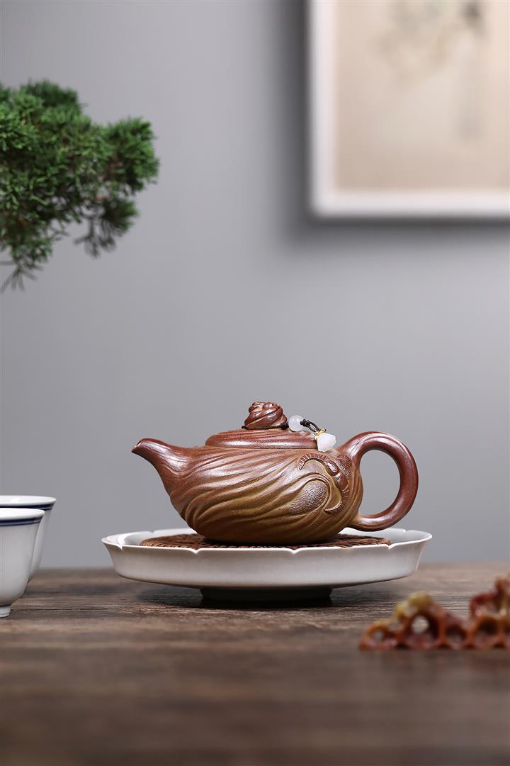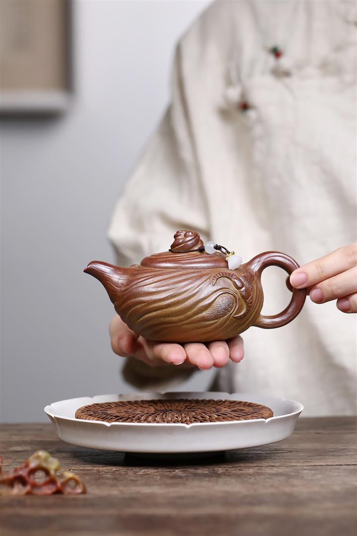 【泥料特點】砂土氣重,似淳實農民,日久使用,漸露鋒芒,養成變化,溫潤莊重。紫砂是壹種雙重氣孔結構的多孔性材質,氣孔微細,密度高。用紫砂壺沏茶,不失原味,且香不渙散,得茶之真香真味。紫砂使用越久,壺身色澤越發光亮照人,氣韻溫雅。紫砂壺長久使用器身會因撫摸擦拭,變得越發溫潤光澤。