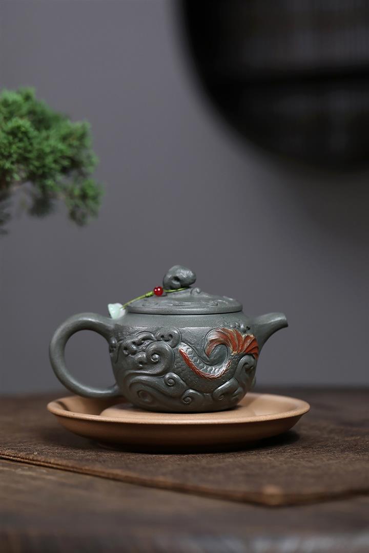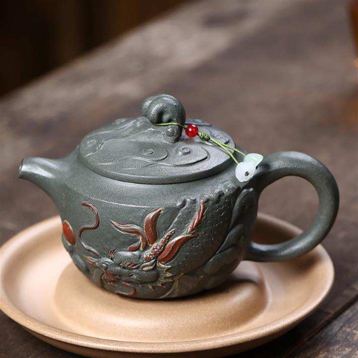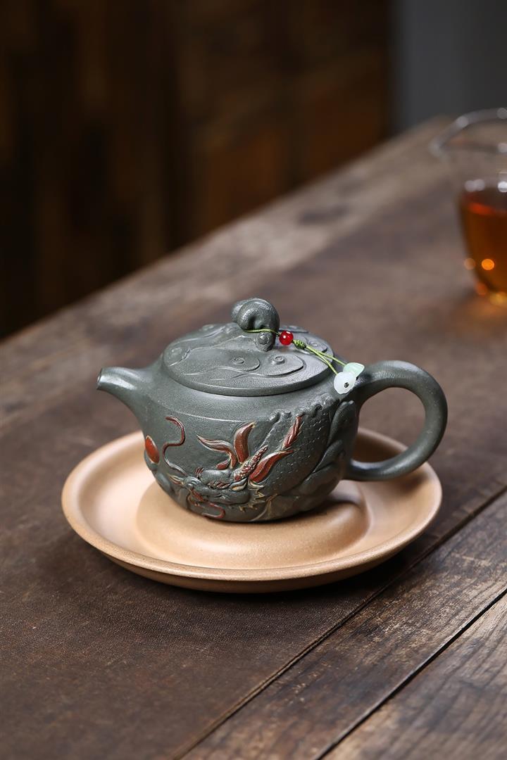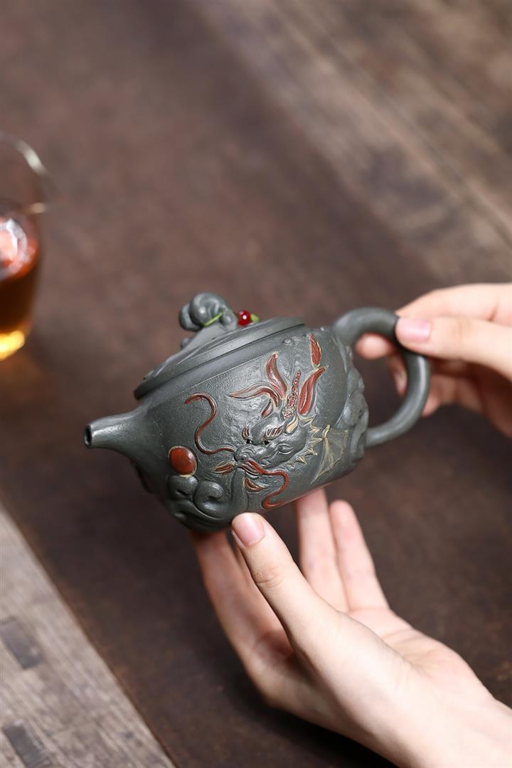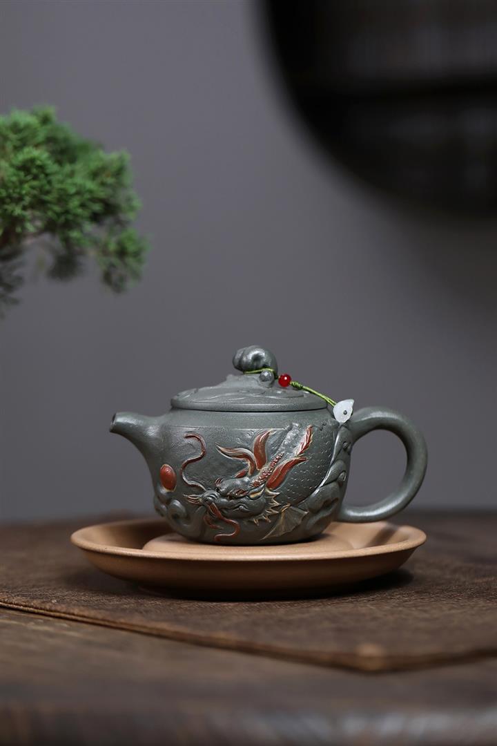 原礦墨綠泥雕龍點睛茶壺POT7736
