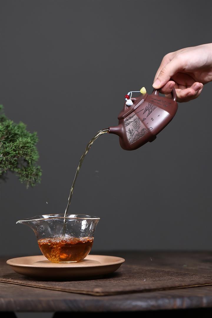 【泥料特點】砂土氣重,似淳實農民,日久使用,漸露鋒芒,養成變化,溫潤莊重。紫砂是壹種雙重氣孔結構的多孔性材質,氣孔微細,密度高。用紫砂壺沏茶,不失原味,且香不渙散,得茶之真香真味。紫砂使用越久,壺身色澤越發光亮照人,氣韻溫雅。紫砂壺長久使用器身會因撫摸擦拭,變得越發溫潤光澤。