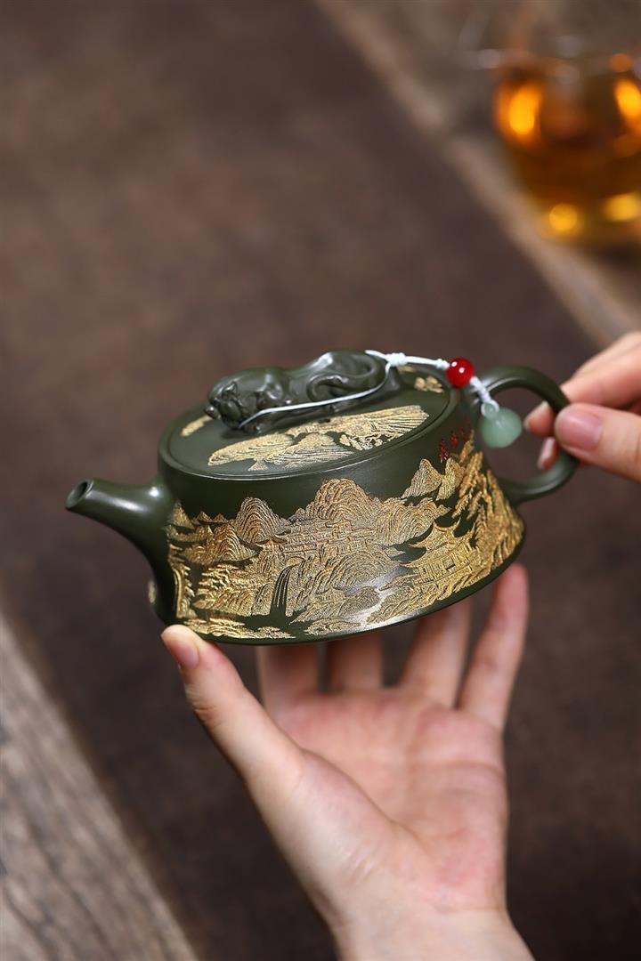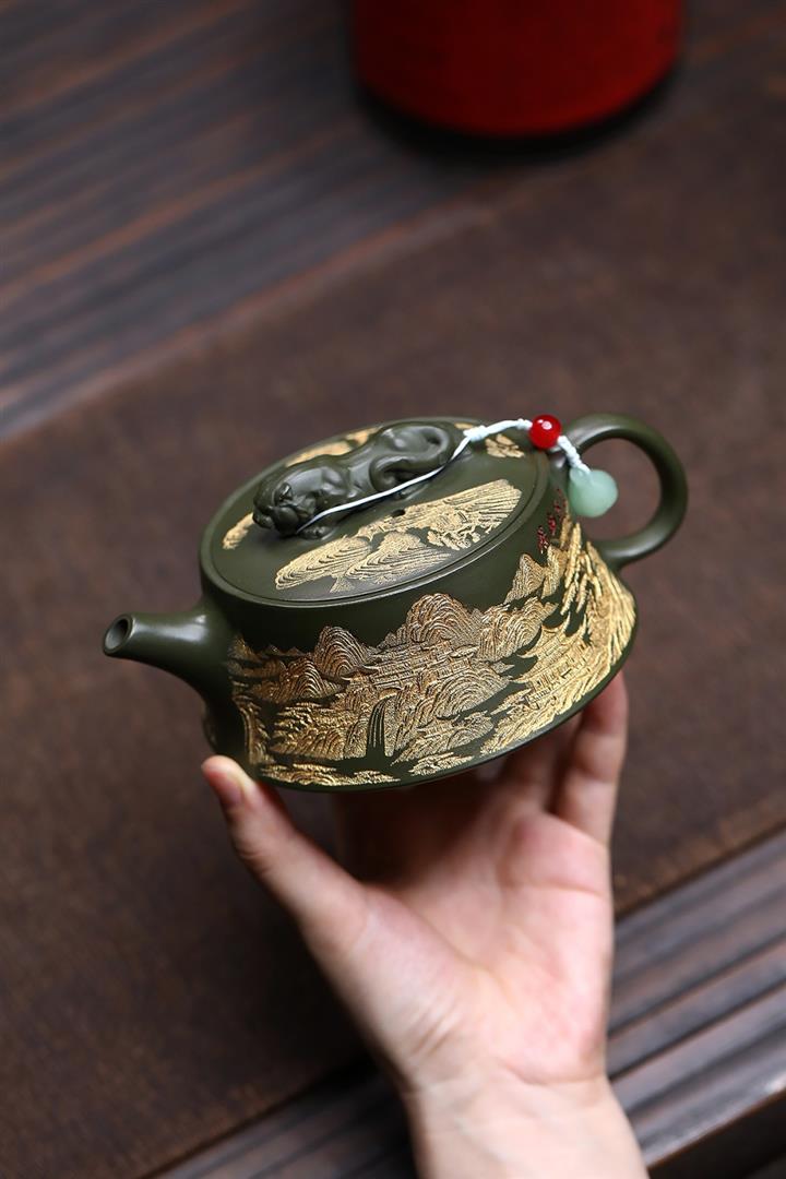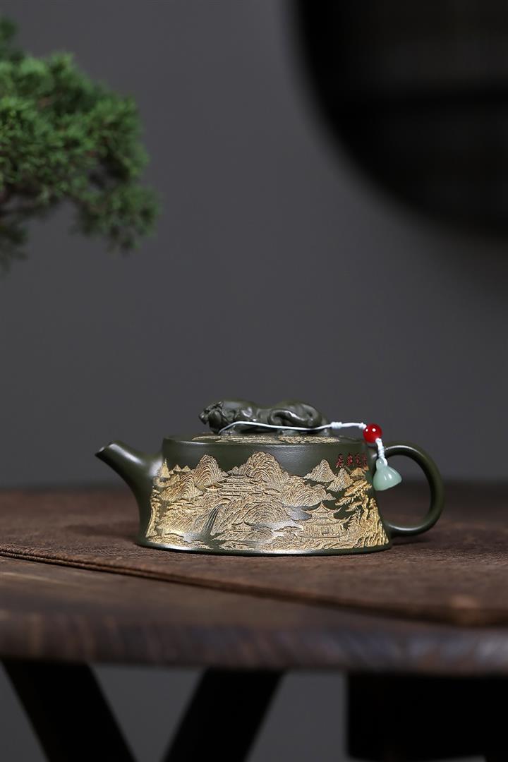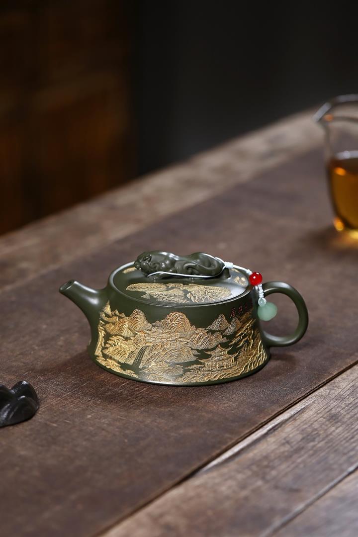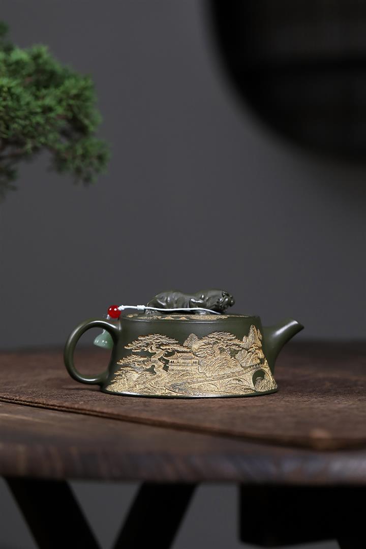原礦綠泥臥虎藏龍內浮雕茶壺POT7844