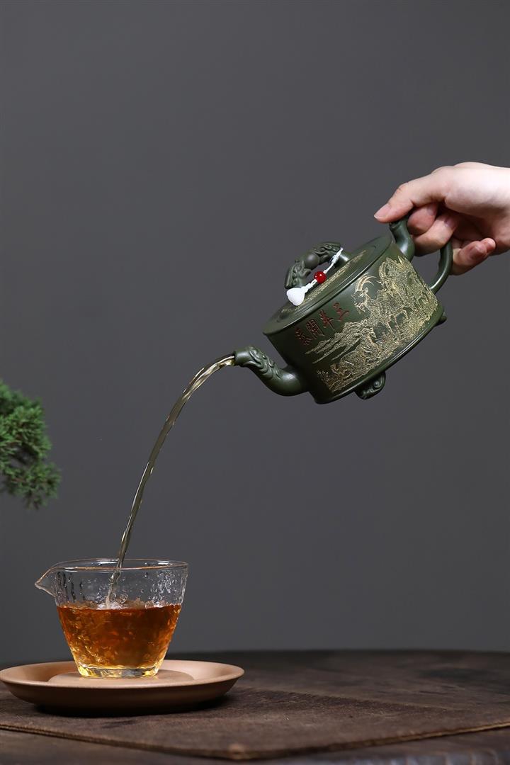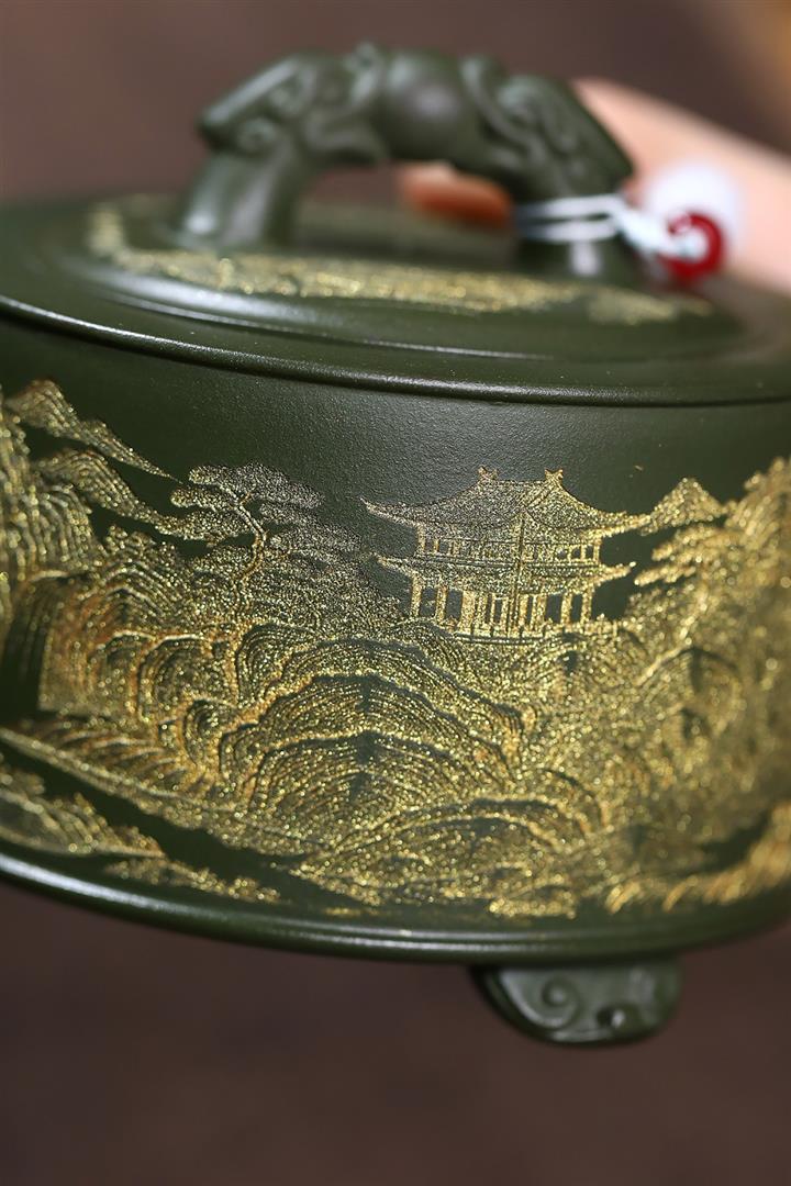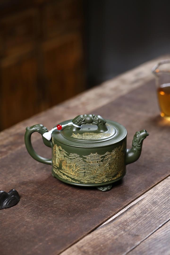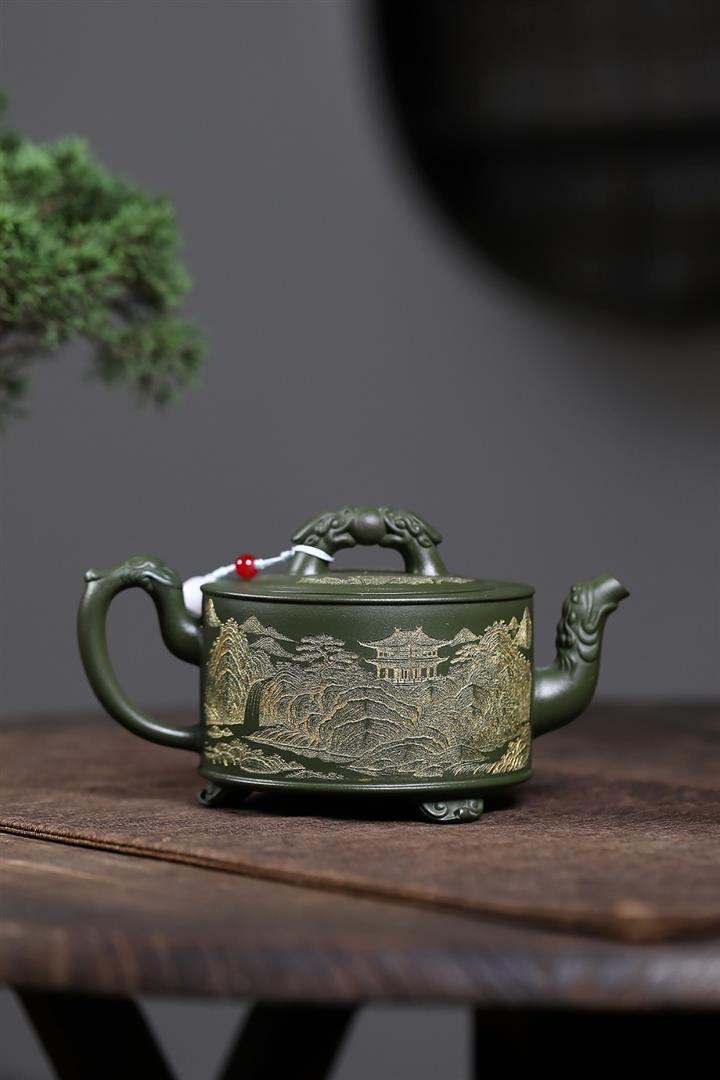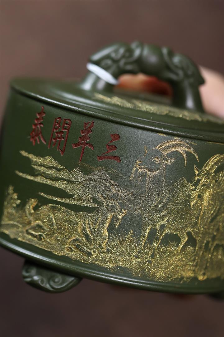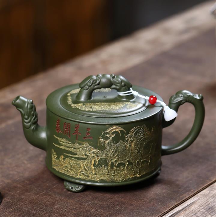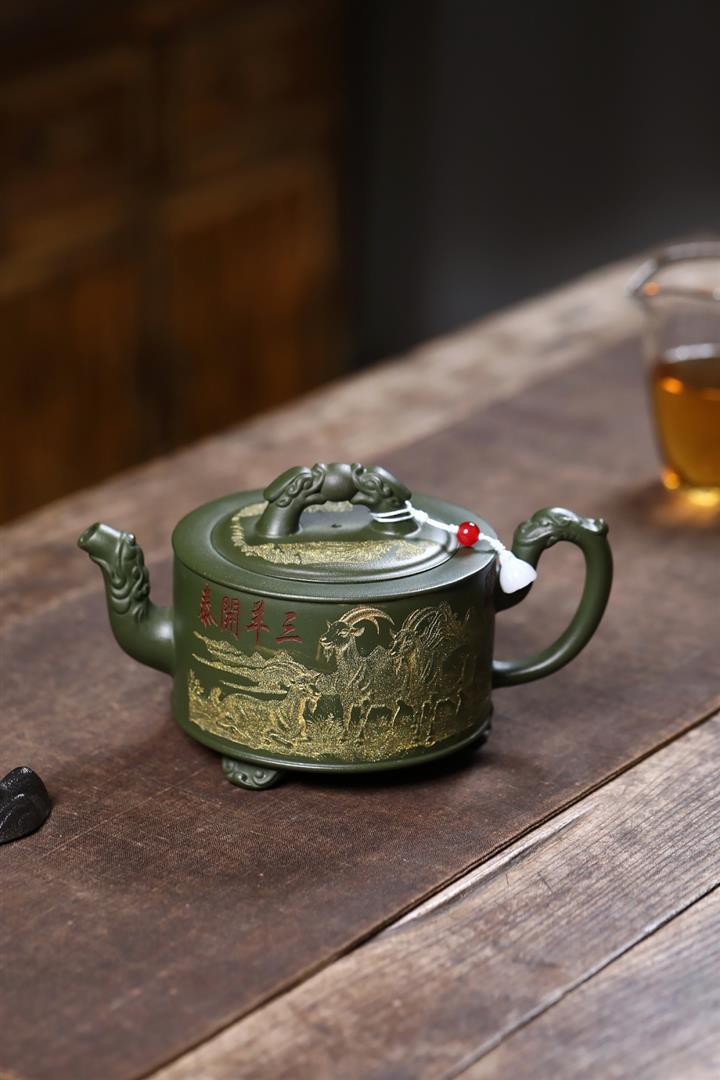 原礦綠泥滿刻三羊開胎茶壺POT7846