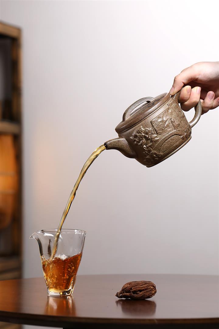 【泥料特點】砂土氣重,似淳實農民,日久使用,漸露鋒芒,養成變化,溫潤莊重。紫砂是壹種雙重氣孔結構的多孔性材質,氣孔微細,密度高。用紫砂壺沏茶,不失原味,且香不渙散,得茶之真香真味。紫砂使用越久,壺身色澤越發光亮照人,氣韻溫雅。紫砂壺長久使用器身會因撫摸擦拭,變得越發溫潤光澤。