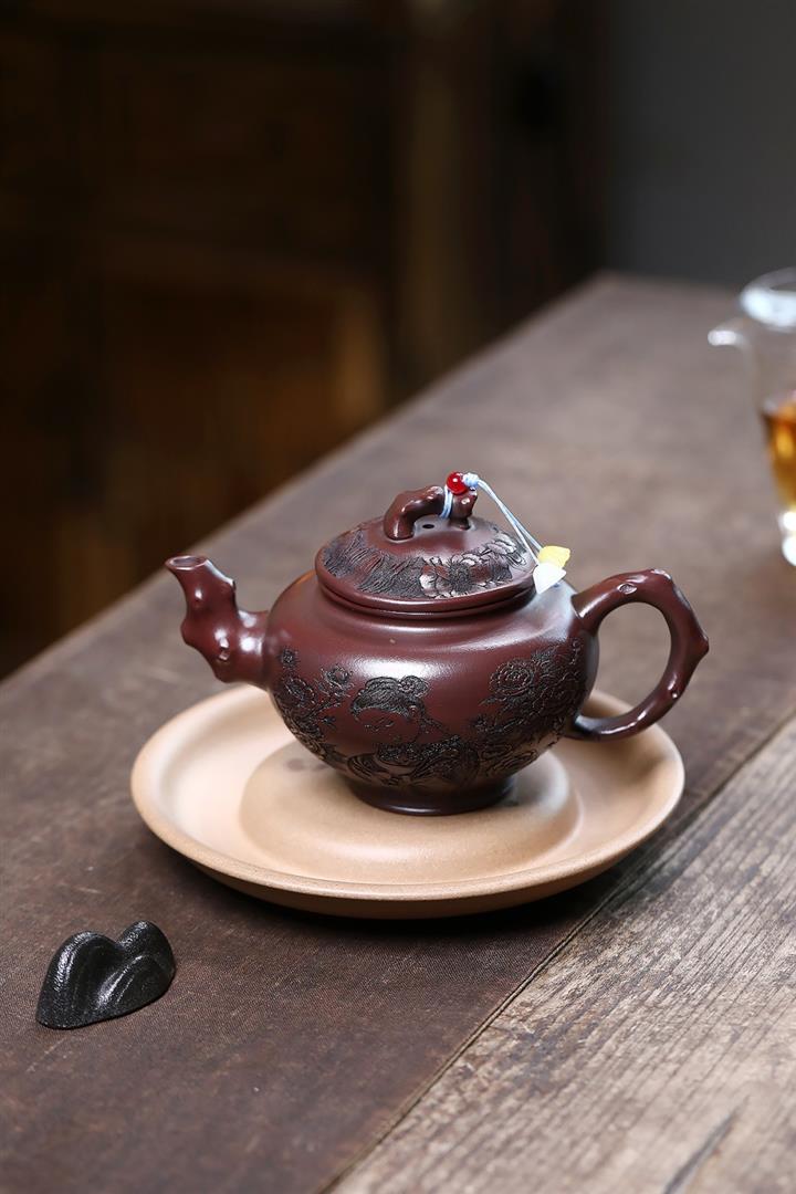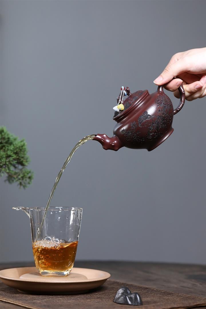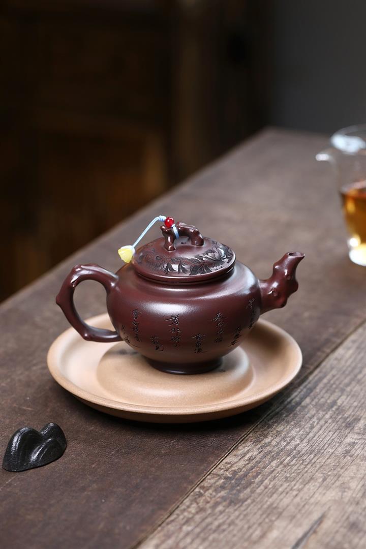 【泥料特點】砂土氣重,似淳實農民,日久使用,漸露鋒芒,養成變化,溫潤莊重。紫砂是壹種雙重氣孔結構的多孔性材質,氣孔微細,密度高。用紫砂壺沏茶,不失原味,且香不渙散,得茶之真香真味。紫砂使用越久,壺身色澤越發光亮照人,氣韻溫雅。紫砂壺長久使用器身會因撫摸擦拭,變得越發溫潤光澤。